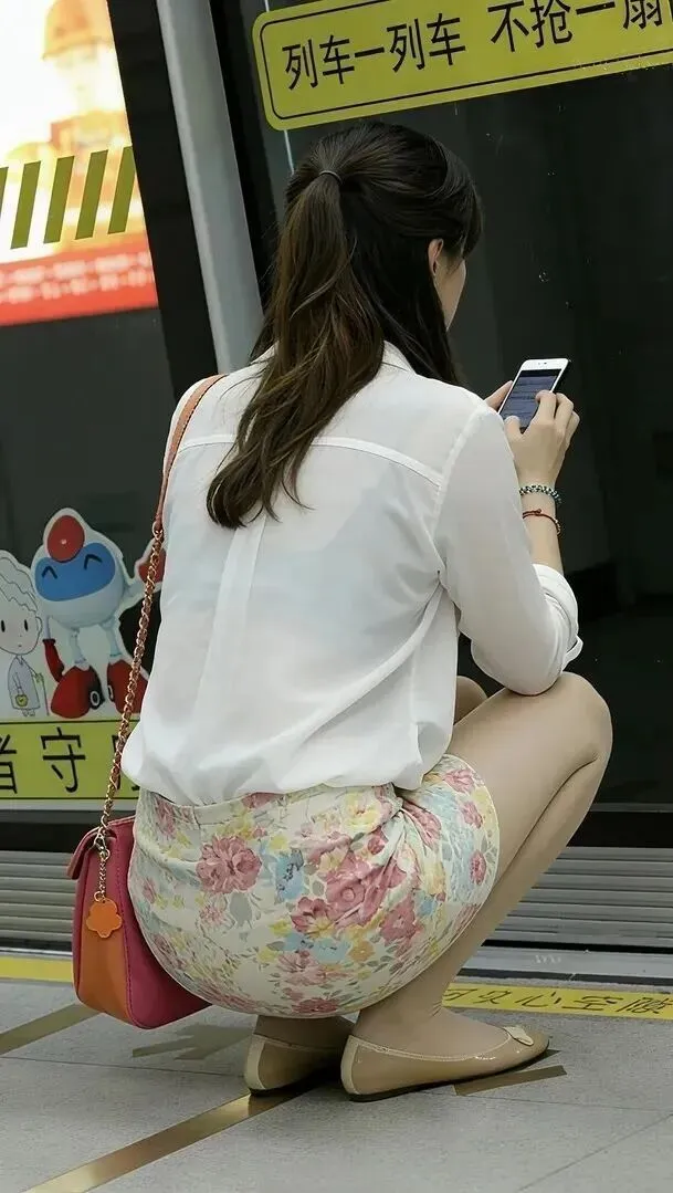 地铁站灯光偏冷,但她一身暖调。米白色的上衣配粉色包和白色碎花短裙的她就是太阳一样的美丽。偶尔会抬头去整理一下头发,衬衫的袖口被弄皱了少许,裙子的包臀线更加明显,链条包轻轻摆动着。简简单单的动作都具有美。