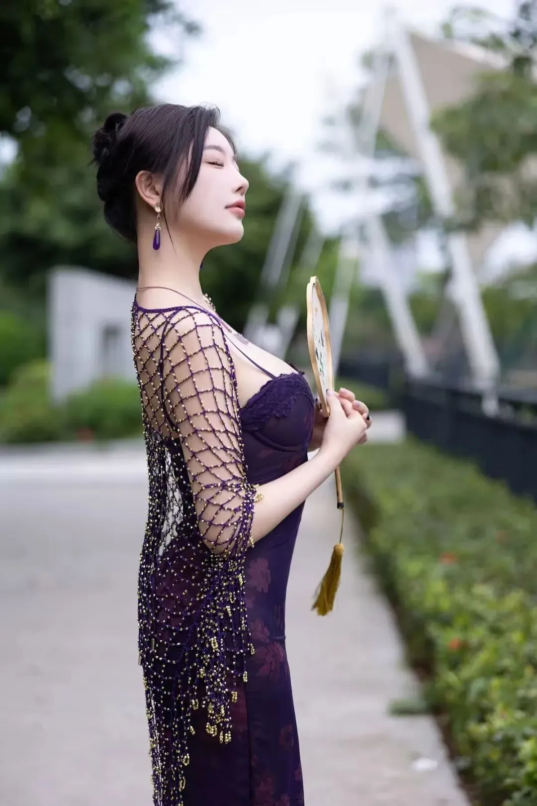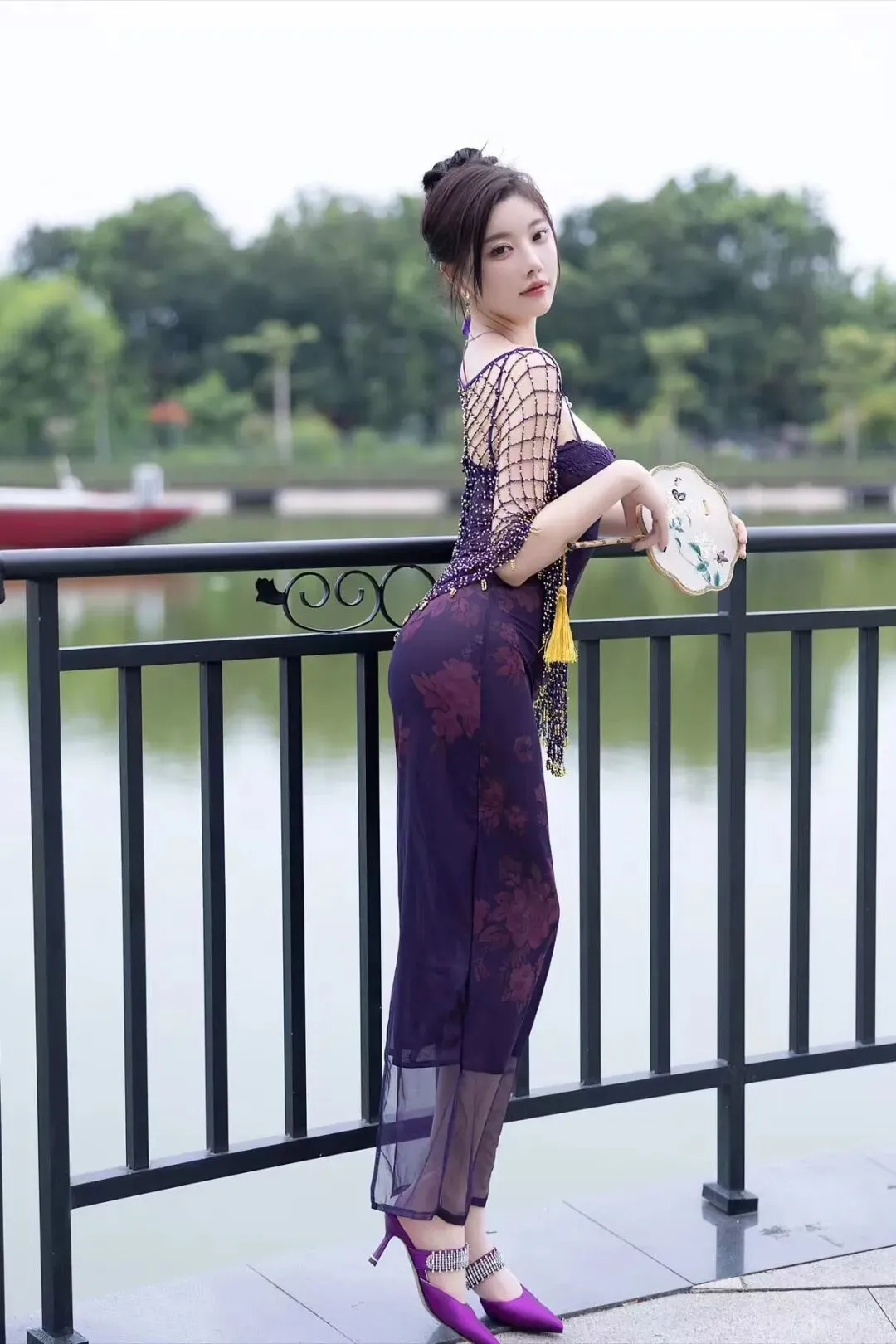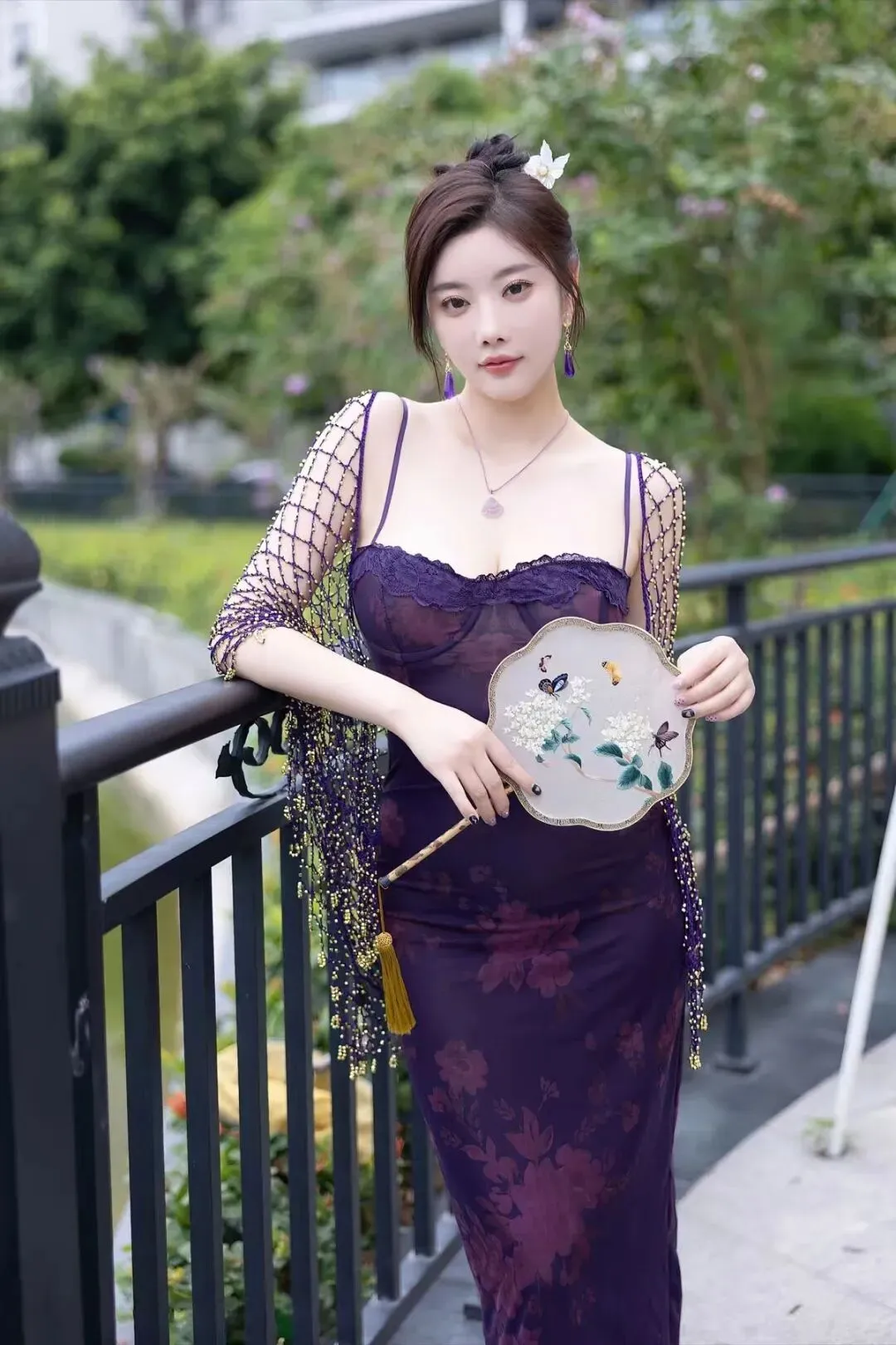 - 款式:改良式无袖旗袍,采用前短后长的开叉设计,内层为贴身蕾丝吊带,外层是半透明的紫色纱质面料,既保留了传统旗袍的曲线感,又增添了现代的性感与飘逸。