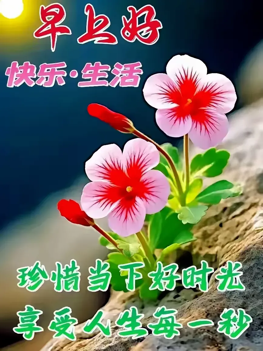 活力四射迎朝霞,动力满满赴前方。挑战虽多志更坚,进步日新创辉煌。晨起问候情意长,愿你今日乐陶陶,早安,美好时光!