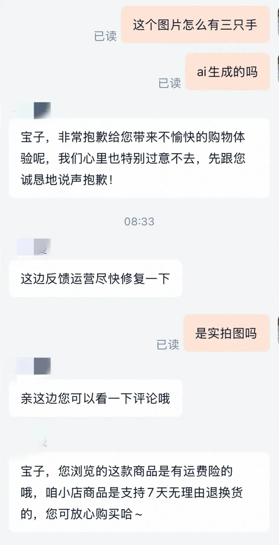 随后,记者再次追问图片是否为实拍,人工客服并未正面回应,反而介绍其售后保障:“您浏览的这款商品是有运费险的哦,咱小店商品是支持7天无理由退换货的”“可以下单试一下”。