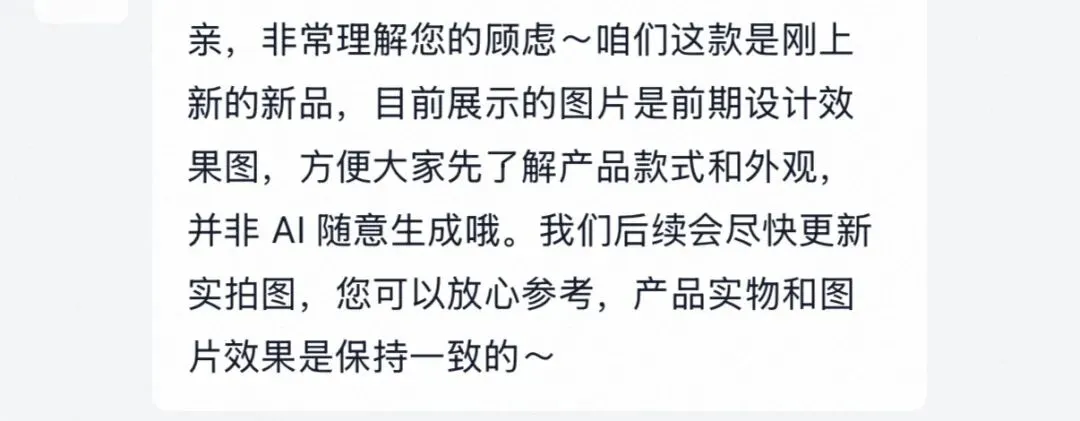 经过几番沟通,人工客服才作出解释,表示:“这款是刚上的新品,目前展示的图片是前期设计效果图,并非 AI 随意生成。我们后续会尽快更新实拍图,可放心参考。”