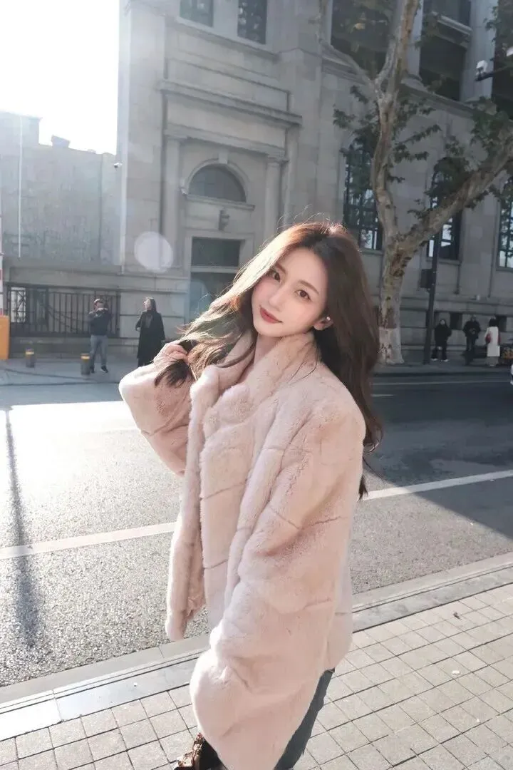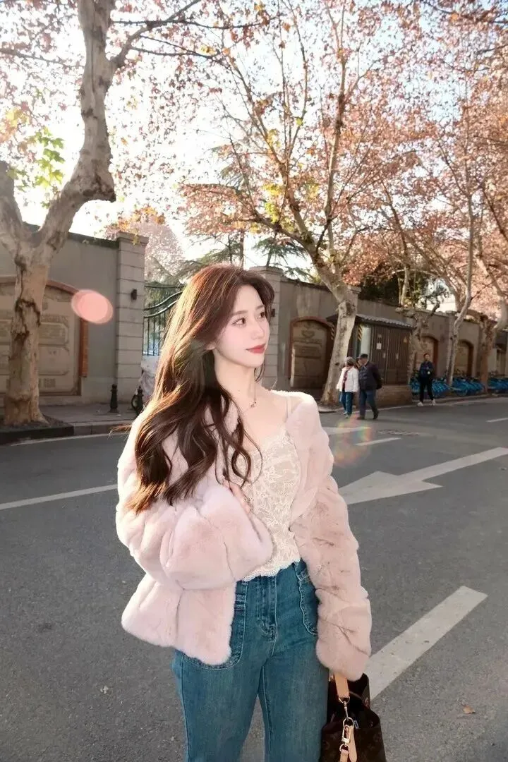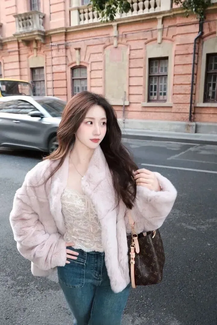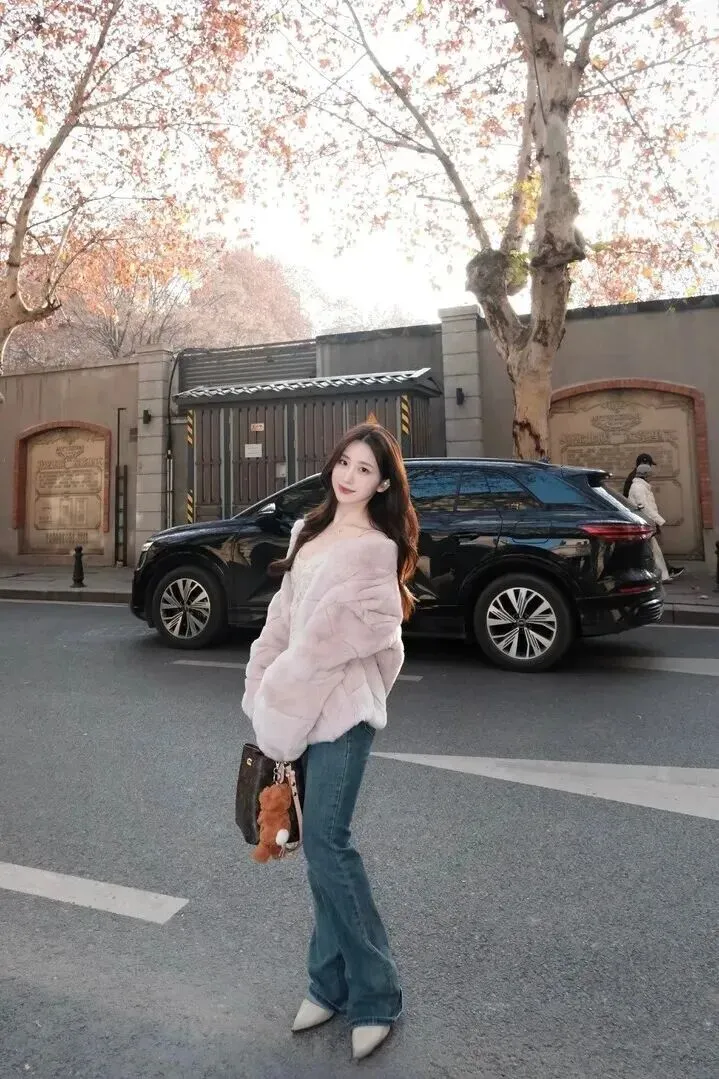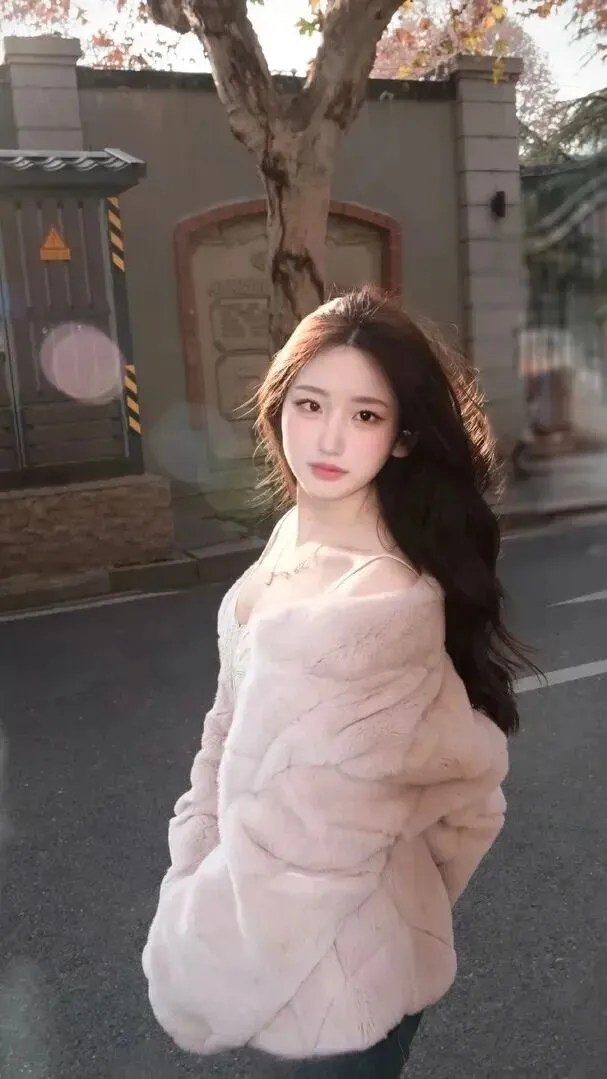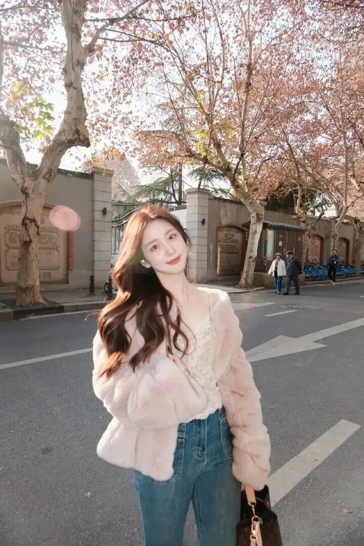 先看一下这套衣服的主要服装,即一件浅粉色的毛绒外套。粉色调得特别柔和,不鲜艳,黄黑皮的女生穿上就会更显白。外套用料毛茸茸的、软软糯糯的,冬天穿上去像裹了一层暖洋洋的毯子。版型为宽松式藏肉效果最好,里面穿厚毛衣也不会显得臃肿。这件外套是甜美感和温暖感并存的,在穿上身之后,整个人都变得温柔起来。