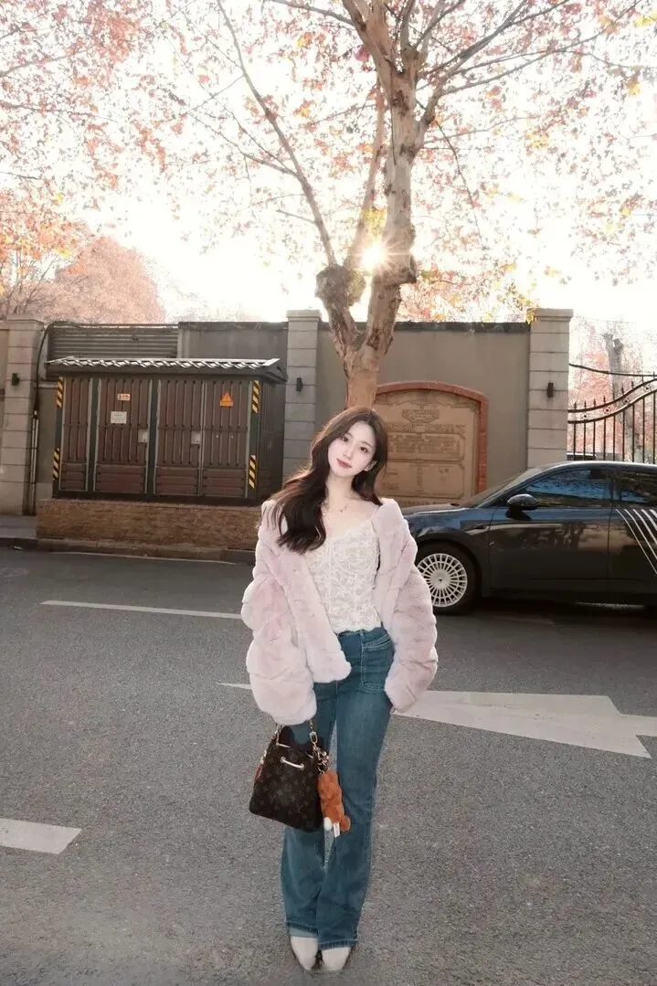 内搭部分用的是白色蕾丝吊带。蕾丝元素本身就带有少女气息,与毛绒外套结合起来就形成了不一样的味道。吊带设计露出一点肩颈线条,使整个人更精致。再配上一条细长的项链,那种若有若无的小心思就出来了。白色和粉色结合在一起,清新减龄,甜度刚刚好。