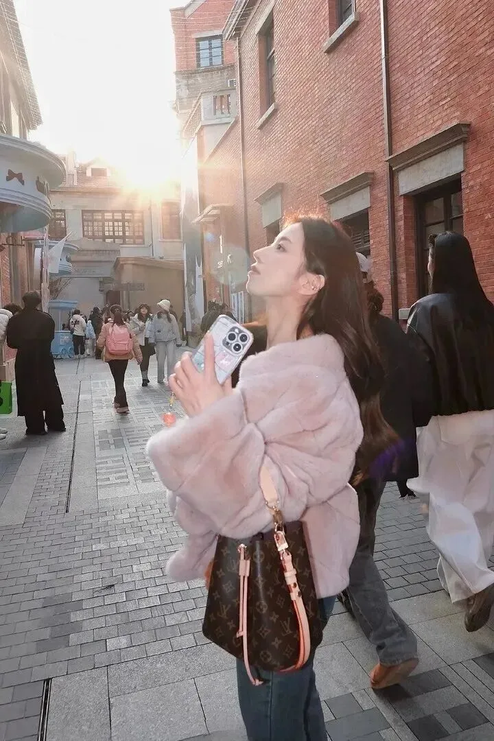 配饰方面也有一定的考虑。挑选出一把经典、复古、大方、方便日常使用的一款手提包。容量大,可以装下手机、钱包等物品,通勤或者逛街都很方便。包上还挂着一个毛绒小熊挂件,可爱程度直线飙升,粉色外套的色调也刚好映衬出来。