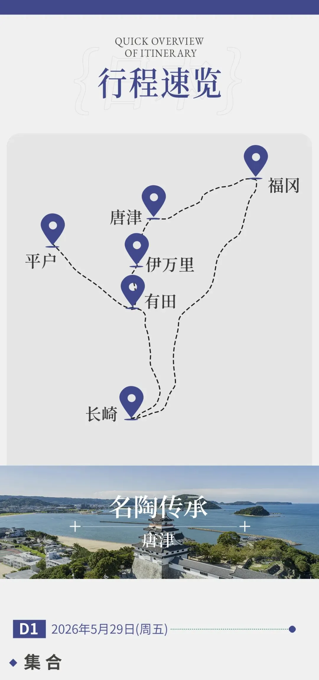 六月初夏,风光正好。我们将漫步虹之松原百万黑松的防风林,享受江户时代藩主留下的自然遗产;登顶稻佐山,将“世界新三大夜景”之一的长崎港尽收眼底;泡进1300年历史的武雄温泉,在“美人之汤”中洗去旅途疲惫;当然还少不了美食与美器的搭配,享用有田烧五膳陶箱便当限定特色午餐,为陶瓷之旅锦上添花!