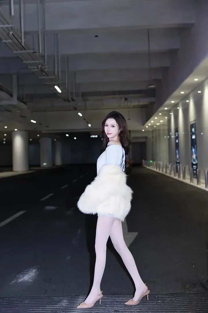 换一个场景就是到了电梯口。其身一袭浅蓝紧腰短装,衫上露肩却不见突显,极得“不露无端,亦无遗处”之意。一件白色的仿皮草外套随手放在身上,脚上穿着一双粉色尖头高跟鞋。她靠在墙上不动,不挪动半分一寸地向前看。蓝色给人以冷静的感觉,毛绒元素又加上了温度,两者对比刚刚好。