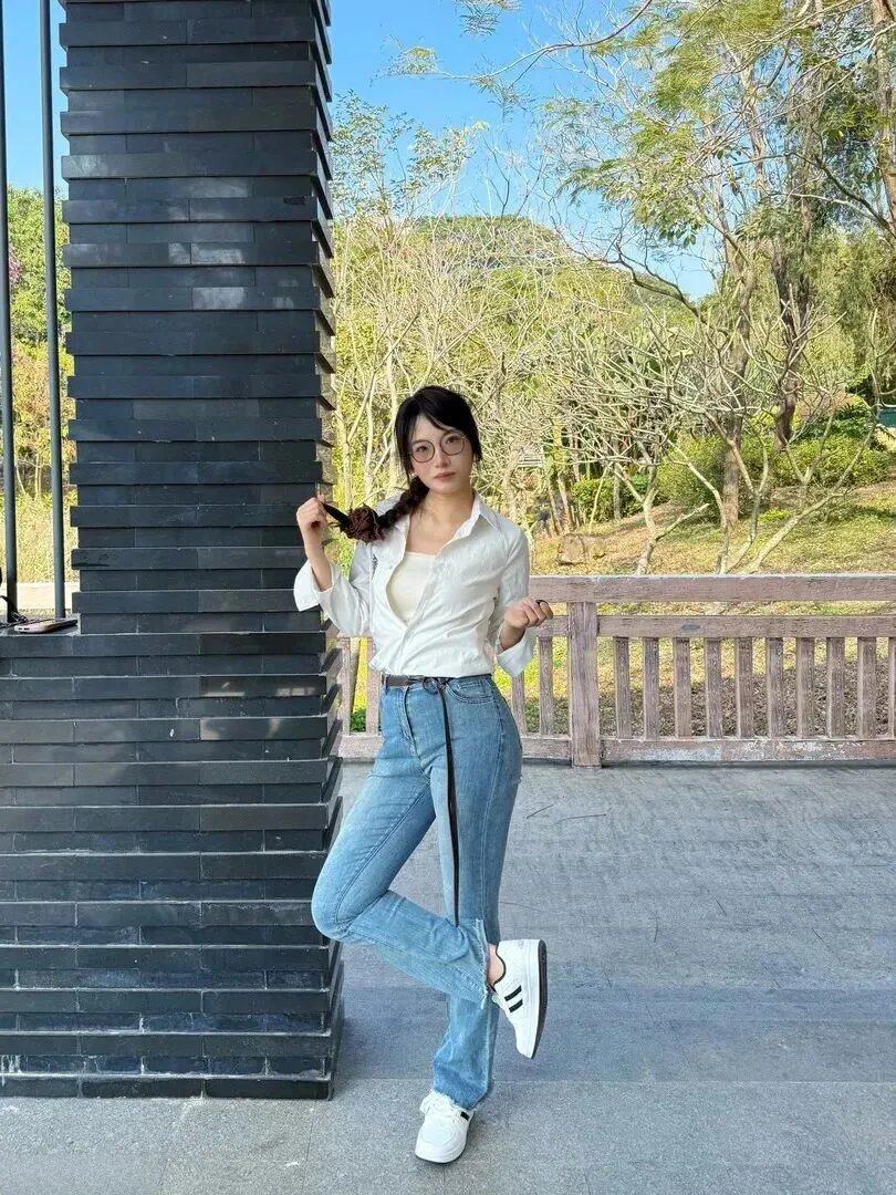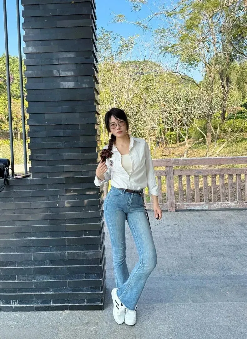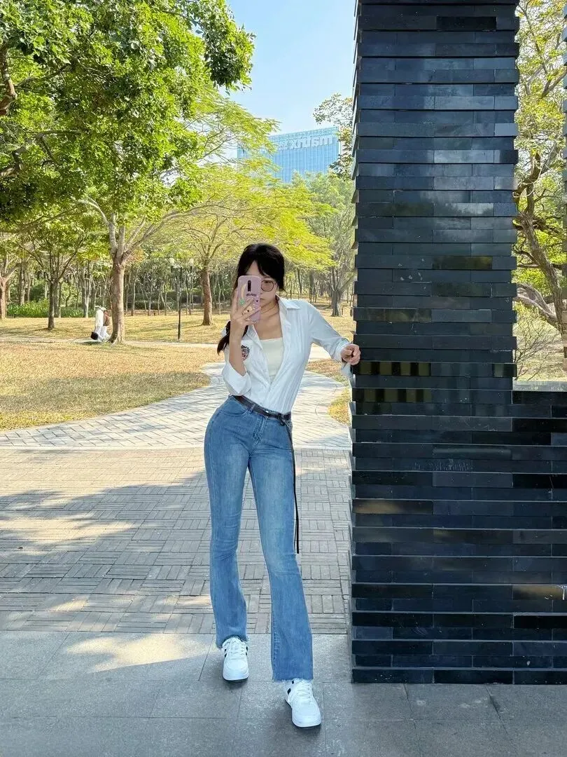 下身穿一件水洗浅蓝的微喇牛仔裤,高腰非常显腿长。复古版型藏肉效果好,穿深棕色皮带后整个色调就突出出来了。脚上穿双纯白运动鞋,走路舒服又显休闲感。不管是上班还是约会,都可以轻易地控制住场面。