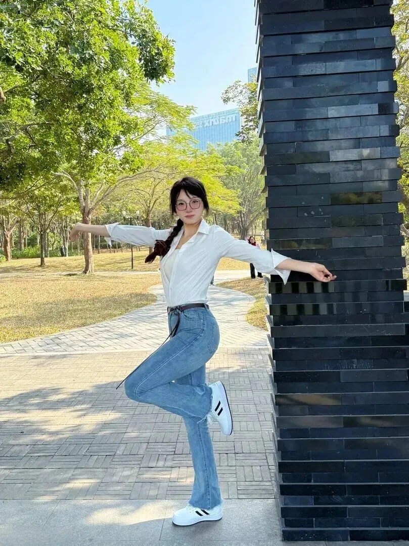 活泼的姿势会使得穿着更富有活力。半跳跃状,左腿90°弯角,右腿伸直,十分可爱。白衬衫+牛仔裤从来都不会出错。