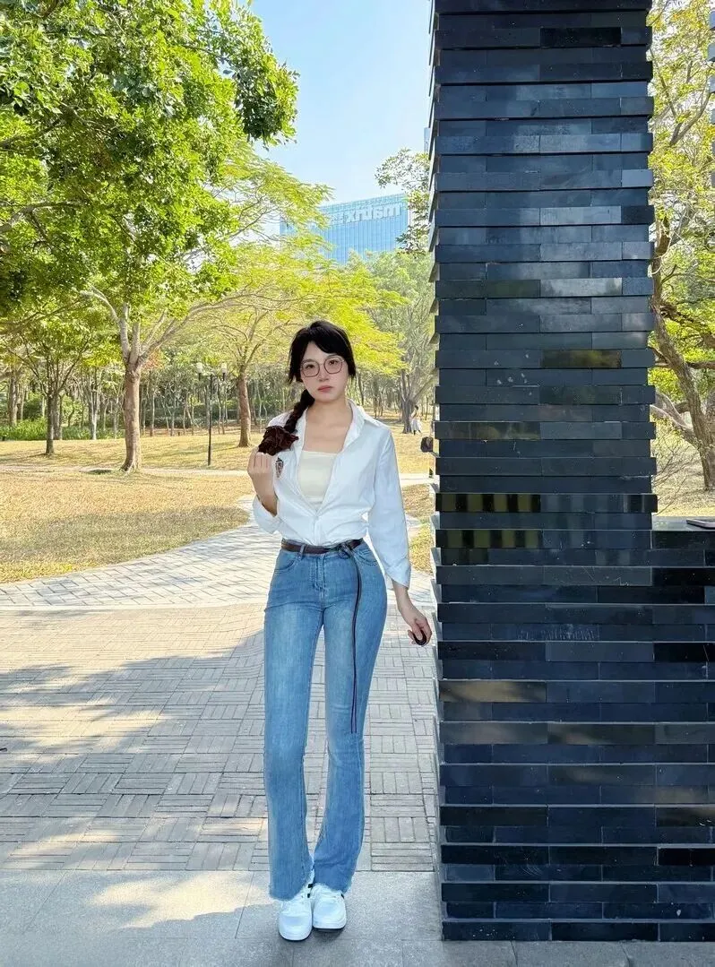 牛仔裤水洗磨白效果好,微喇版型显腿直。脚上穿着一双厚底板鞋,增高效果很好又百搭,小个子姐妹穿起来也能显出大长腿。从整体上看它灵动又少女,夏天穿这样的衣服出门心情会变好。