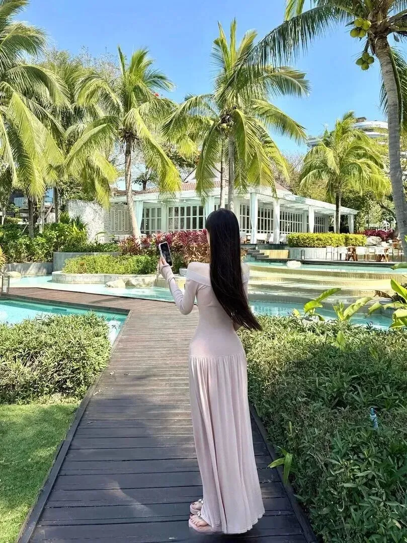 背面设计更惊艳之处在于微微露背剪裁与裙摆褶皱,行走时背影就十分丰富有层次。长发自然垂下,若隐若现的肌肤具有极好的性感、含蓄之美。她并不是刻意摆拍的,就是尽情享受假期的那种放松感非常难得。游客所看到的并不是一句句说,这才是度假该有的样子?
