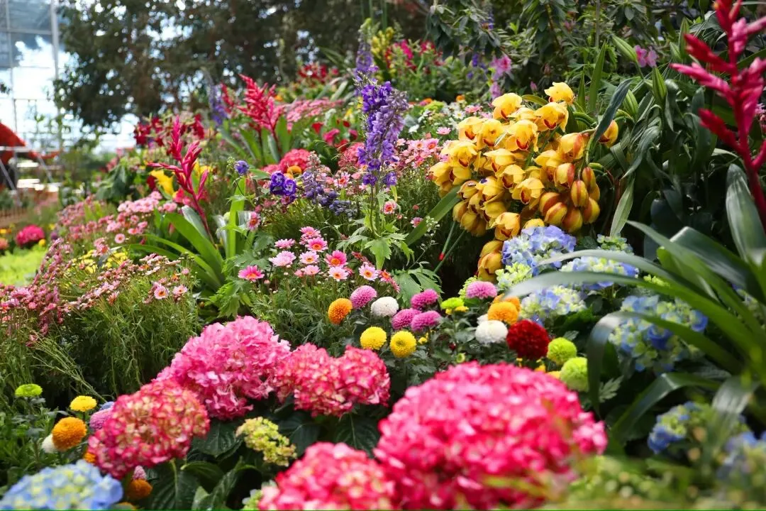 粉白、橙黄、玫红织成绝美花毯
