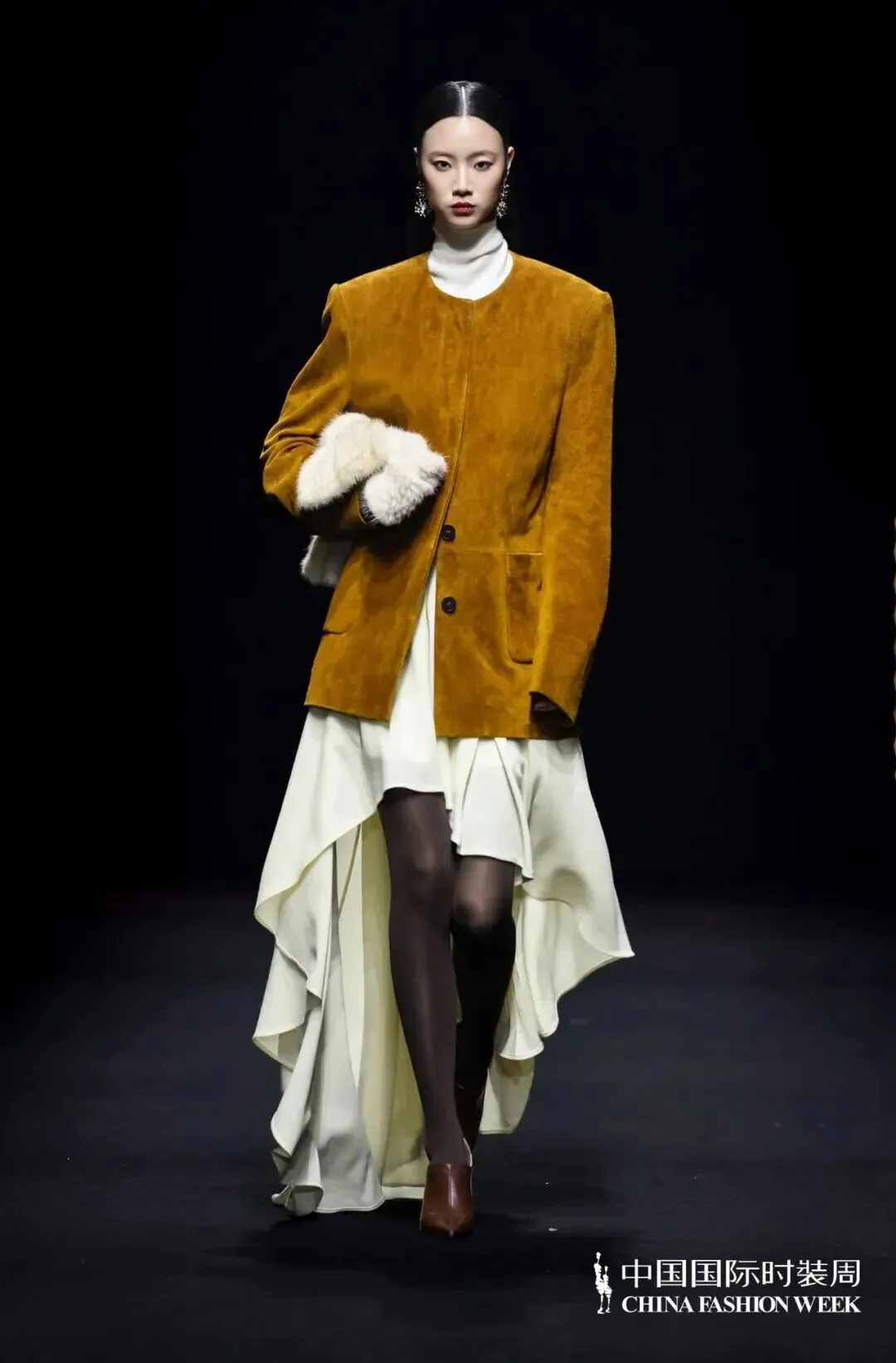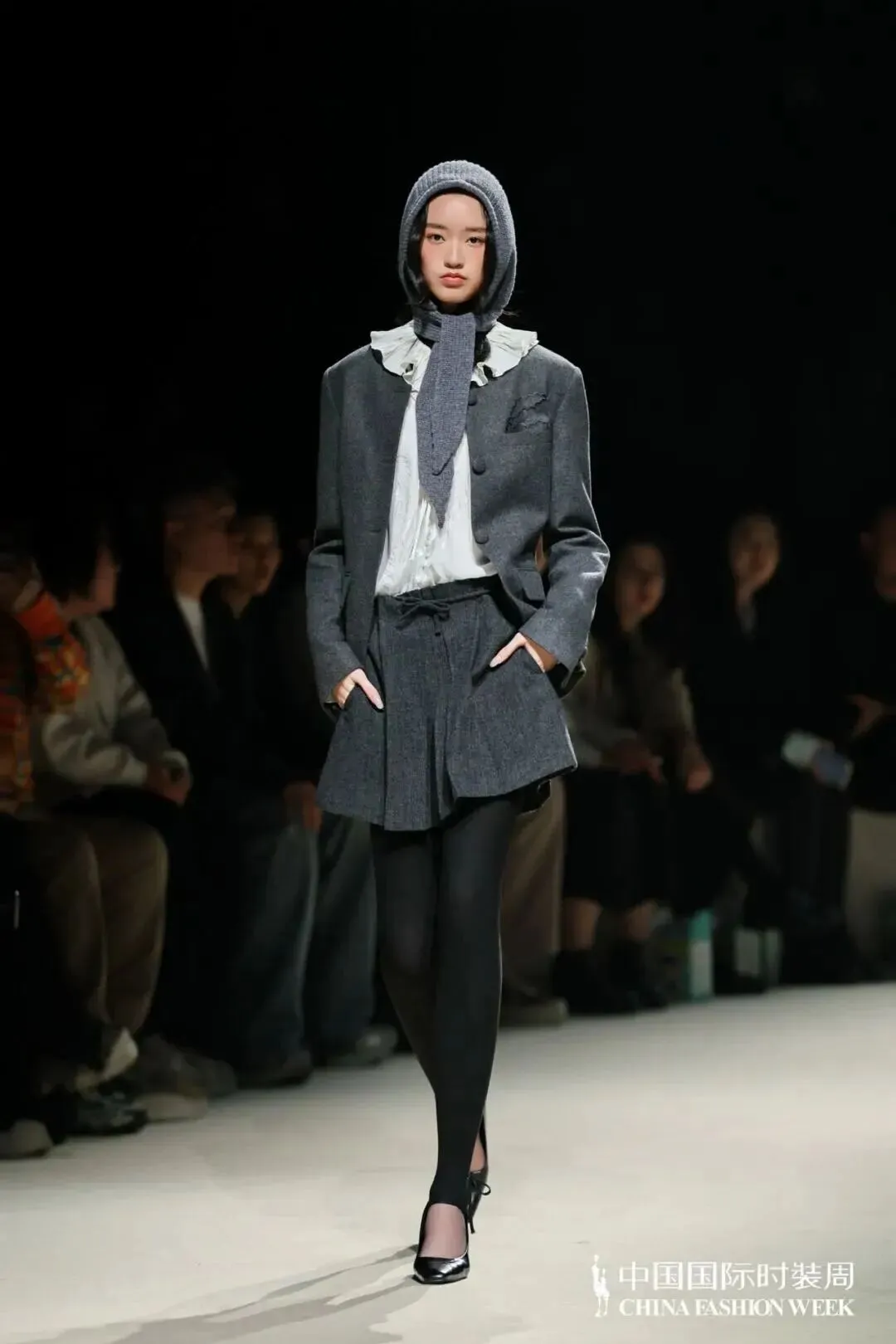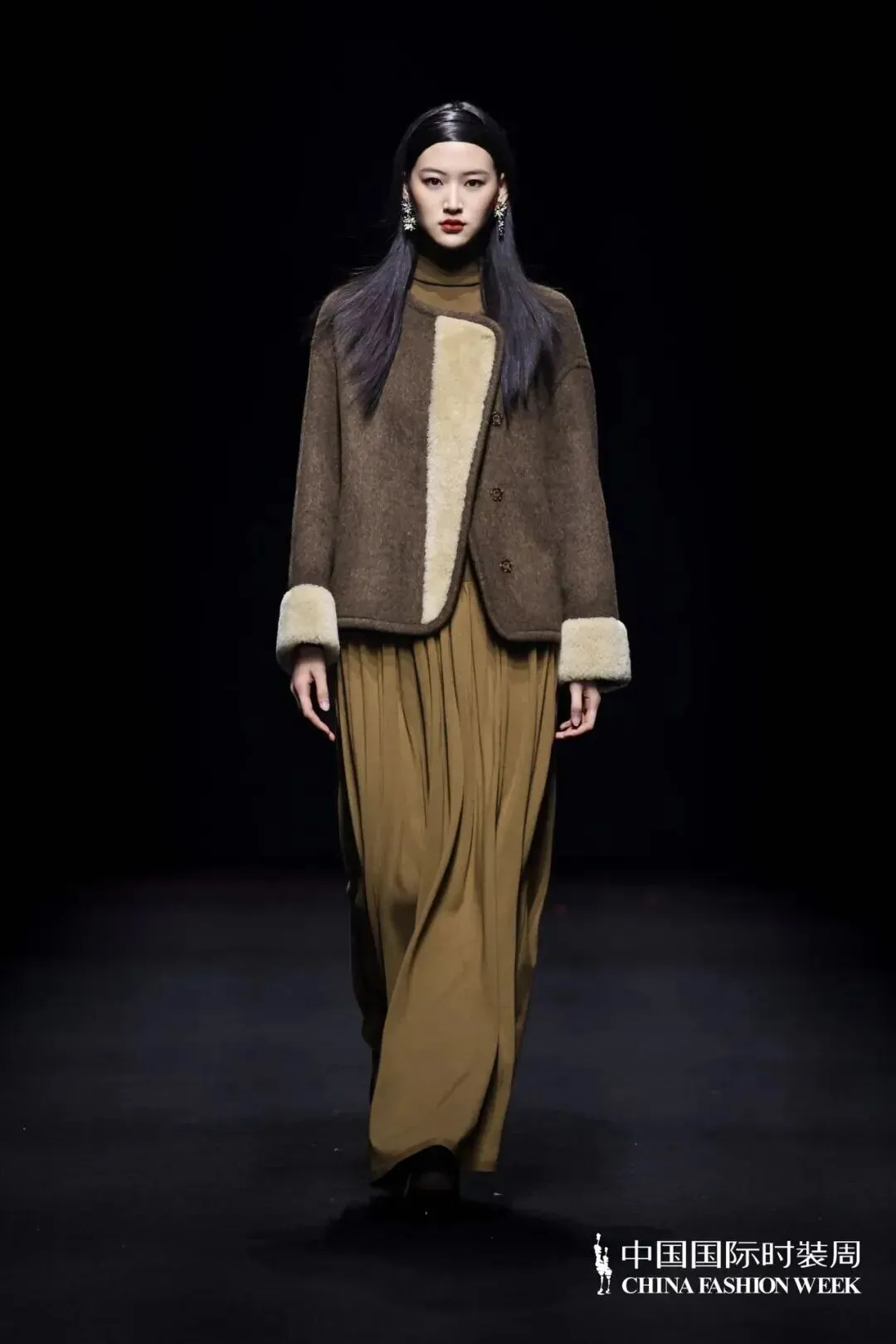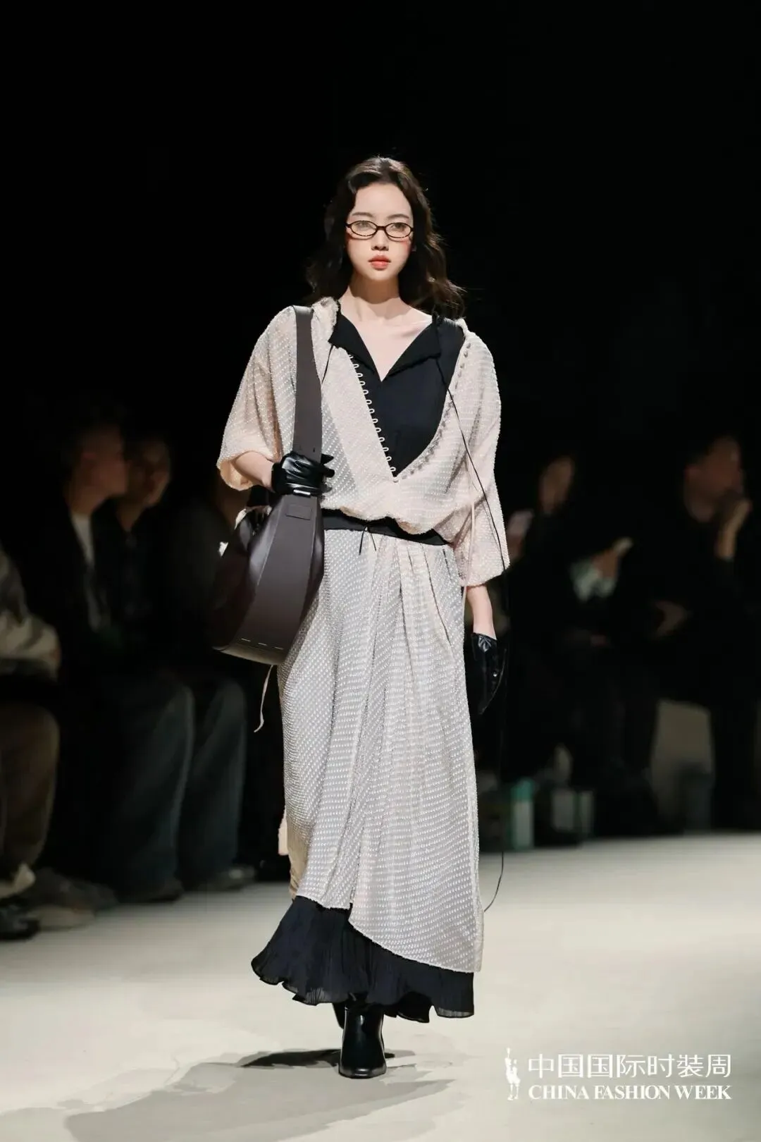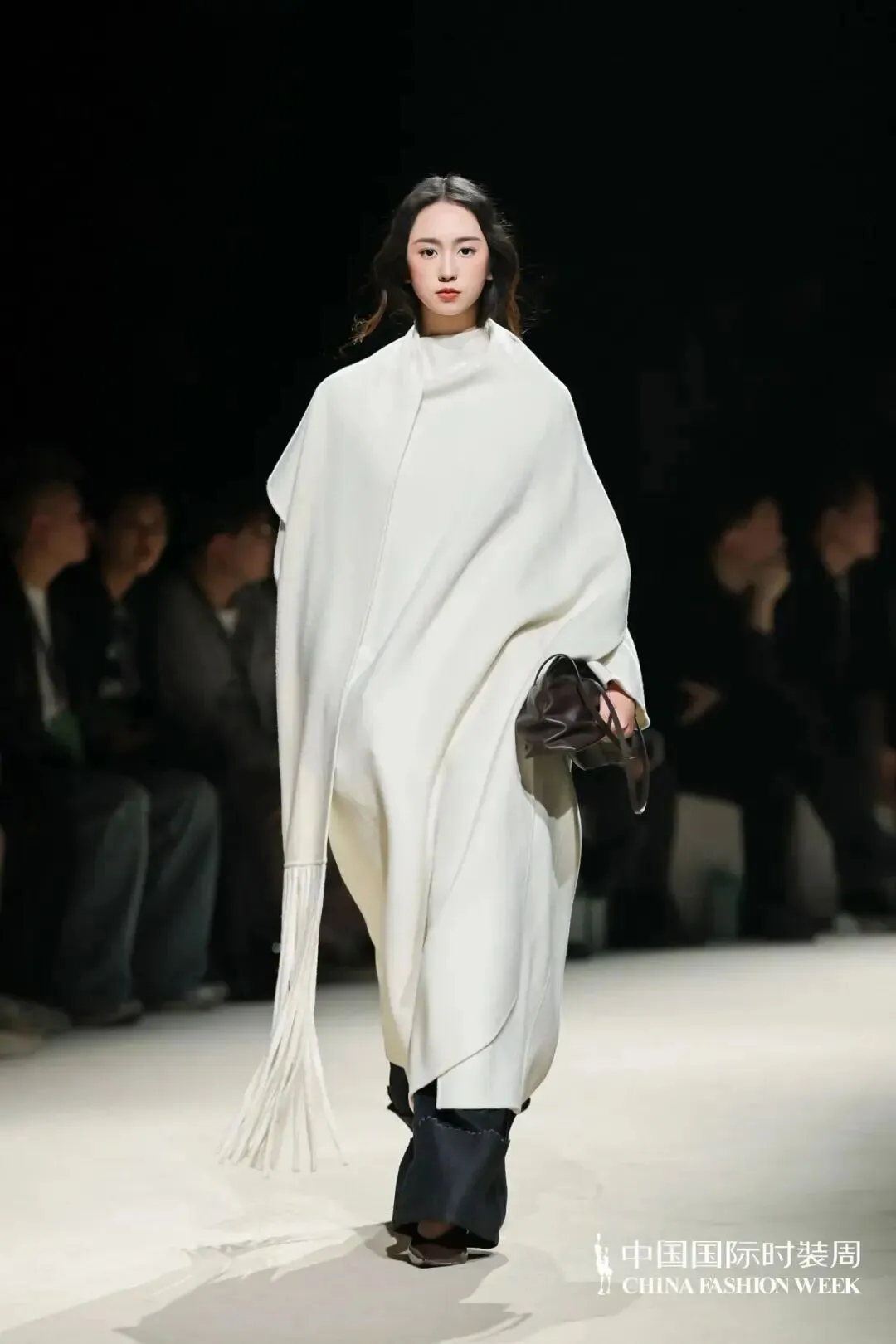 设计师胡莹莹将本季核心命题凝练为双向辩证:“三代温度传承,馨然于心,感触于身”。在秀场分明的四根立柱中,女性力量,被提到了绝对明晰的位置。本季概念经由材质的触觉    叙事,完成了从抽象概念到具身体验的转化。系列灵感源起于一个私密且温暖的生活切片:设计师女儿的一句童言——“妈妈,衣服像你抱着我一样暖。” 这一瞬间的触感记忆,促使胡莹莹回溯家族女性的衣着谱系。从母亲的缝纫机到女儿的羊绒衫,「馨·触觉」实则是一次跨代际的身体对话,是三代女性共同构建的情感体系,共谋传承衣橱的新故事。
