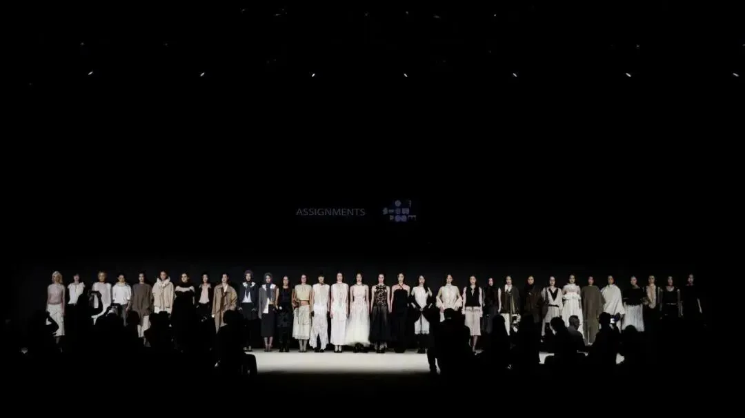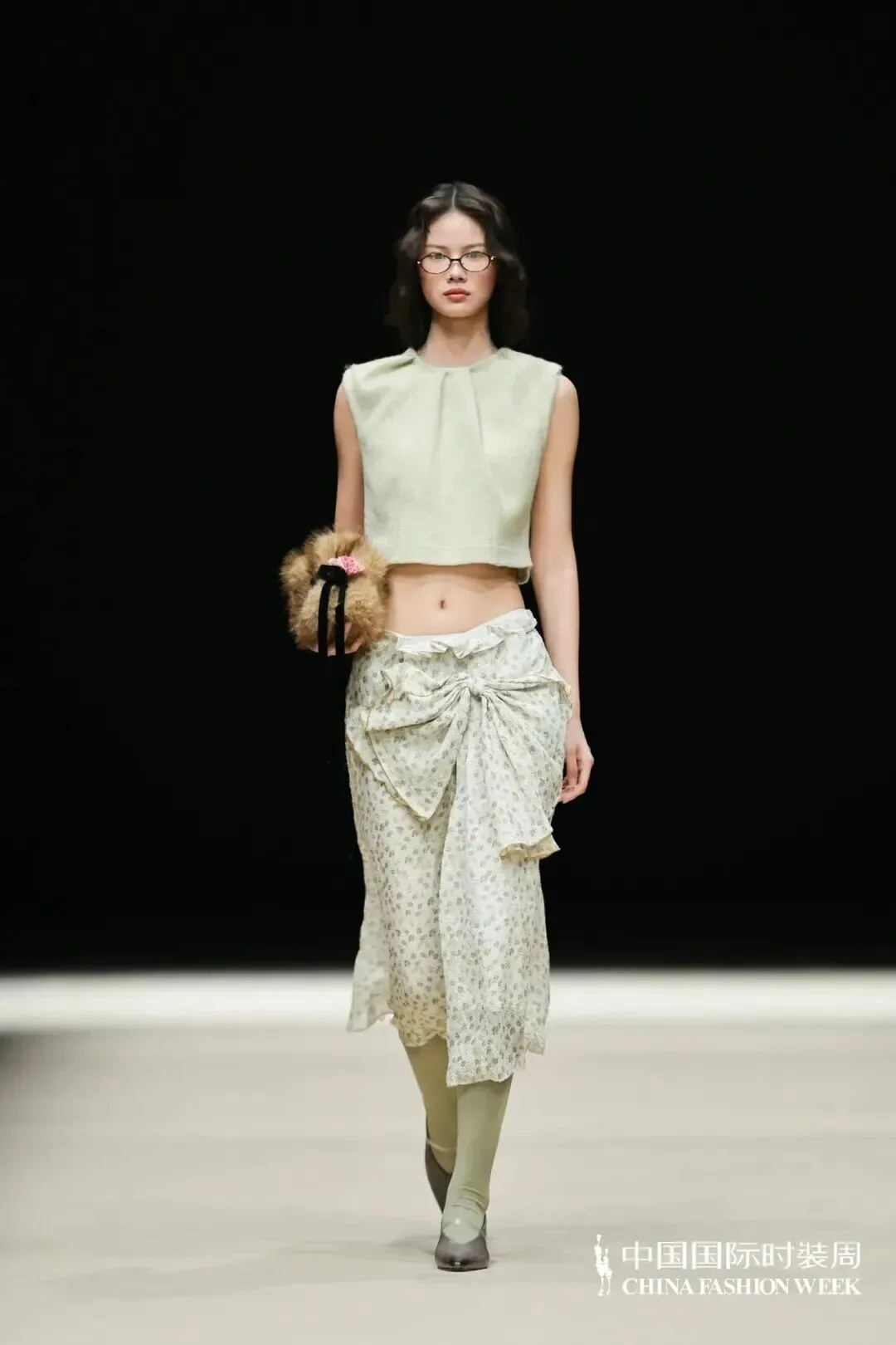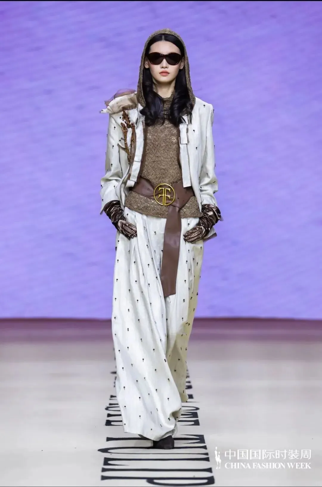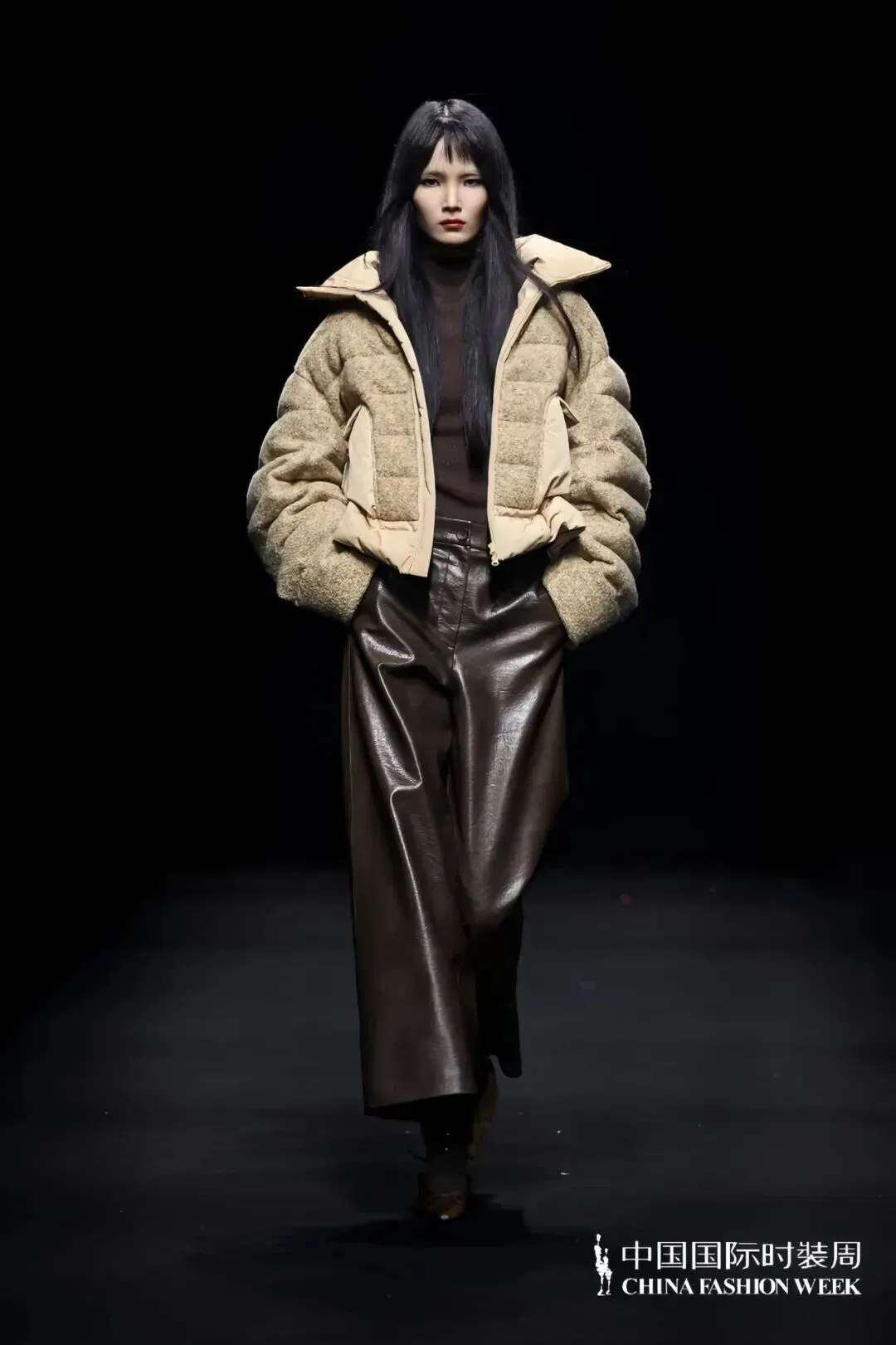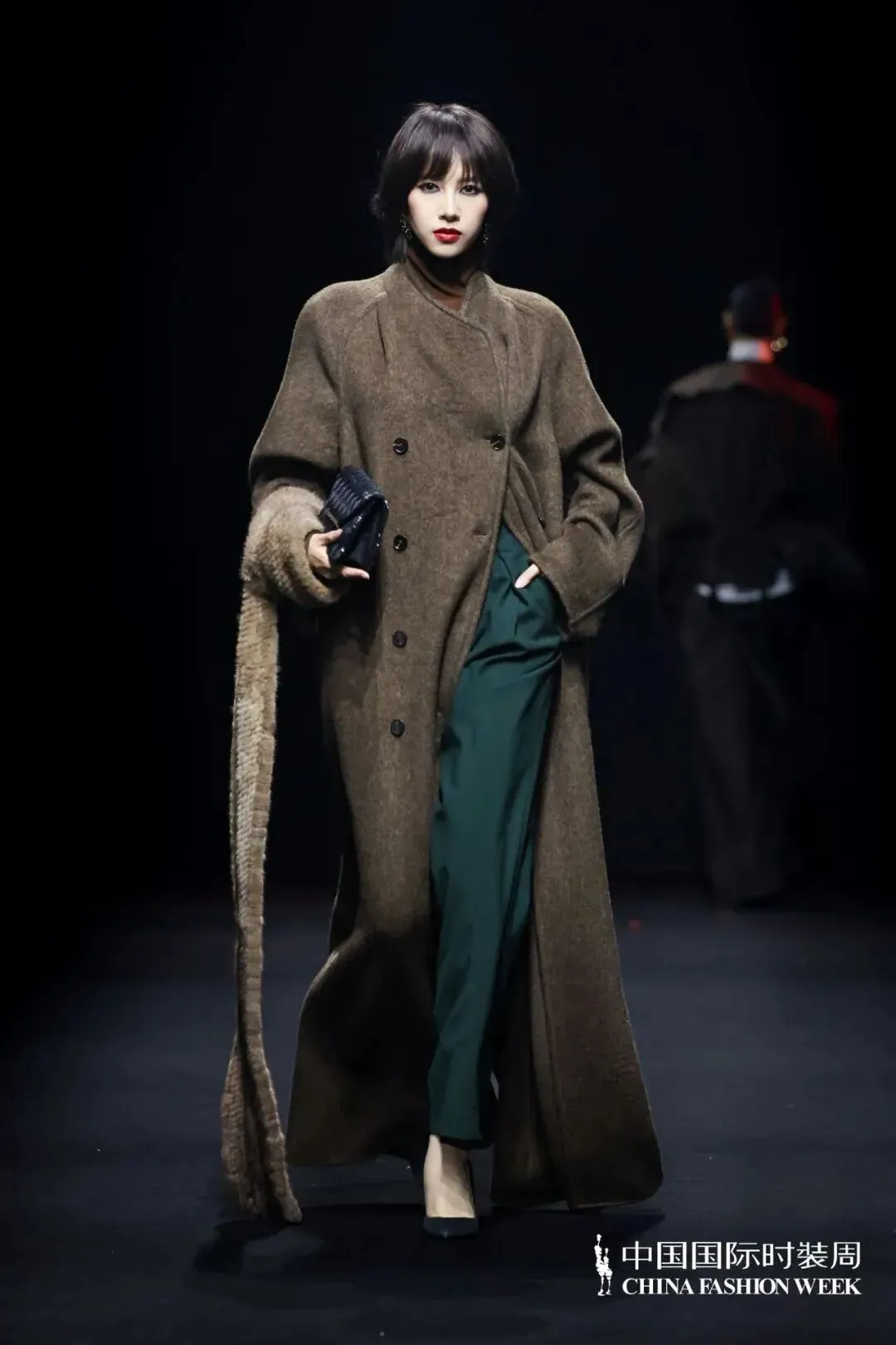 设计师胡莹莹将本季核心命题凝练为双向辩证:“三代温度传承,馨然于心,感触于身”。在秀场分明的四根立柱中,女性力量,被提到了绝对明晰的位置。本季概念经由材质的触觉    叙事,完成了从抽象概念到具身体验的转化。系列灵感源起于一个私密且温暖的生活切片:设计师女儿的一句童言——“妈妈,衣服像你抱着我一样暖。” 这一瞬间的触感记忆,促使胡莹莹回溯家族女性的衣着谱系。从母亲的缝纫机到女儿的羊绒衫,「馨·触觉」实则是一次跨代际的身体对话,是三代女性共同构建的情感体系,共谋传承衣橱的新故事。