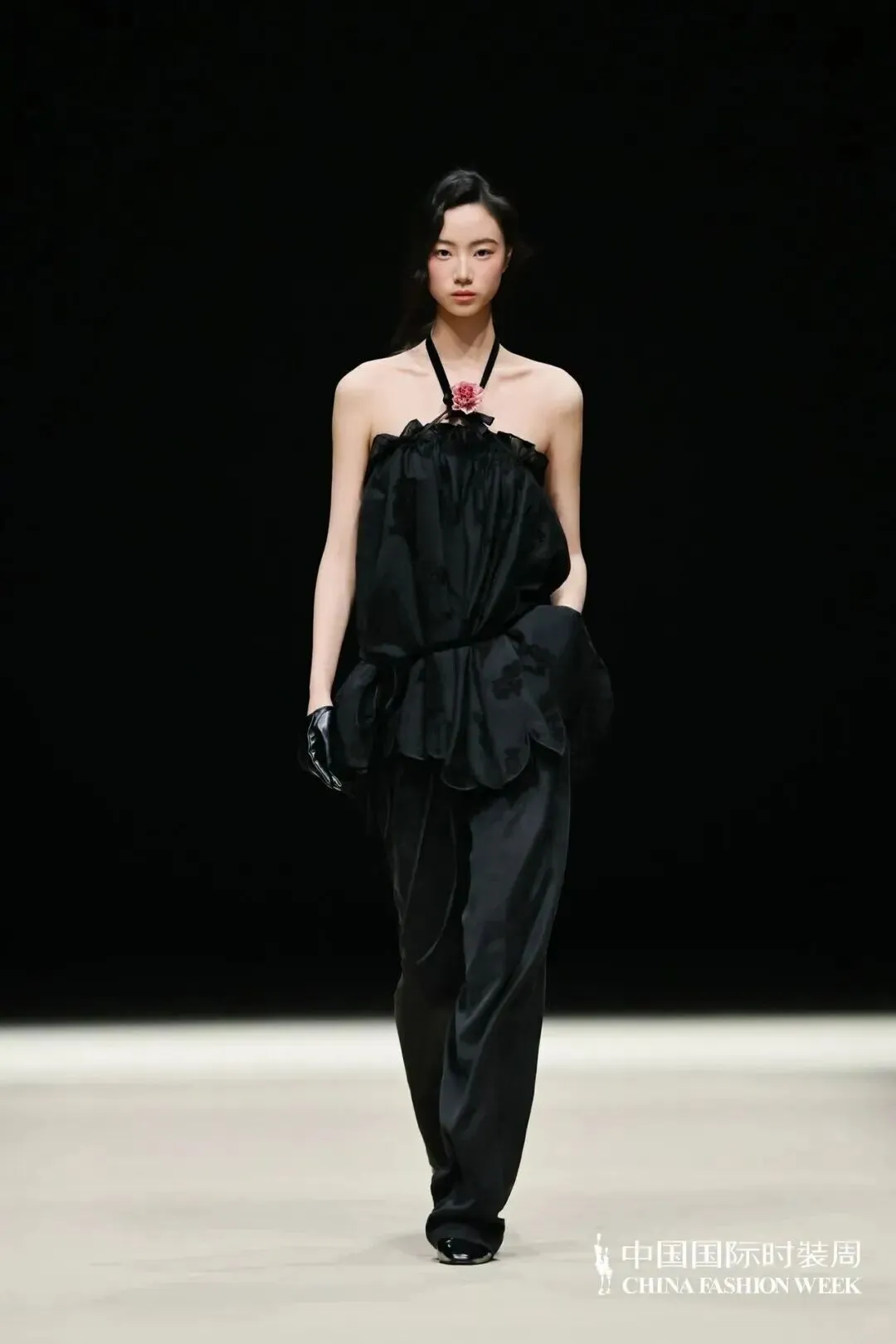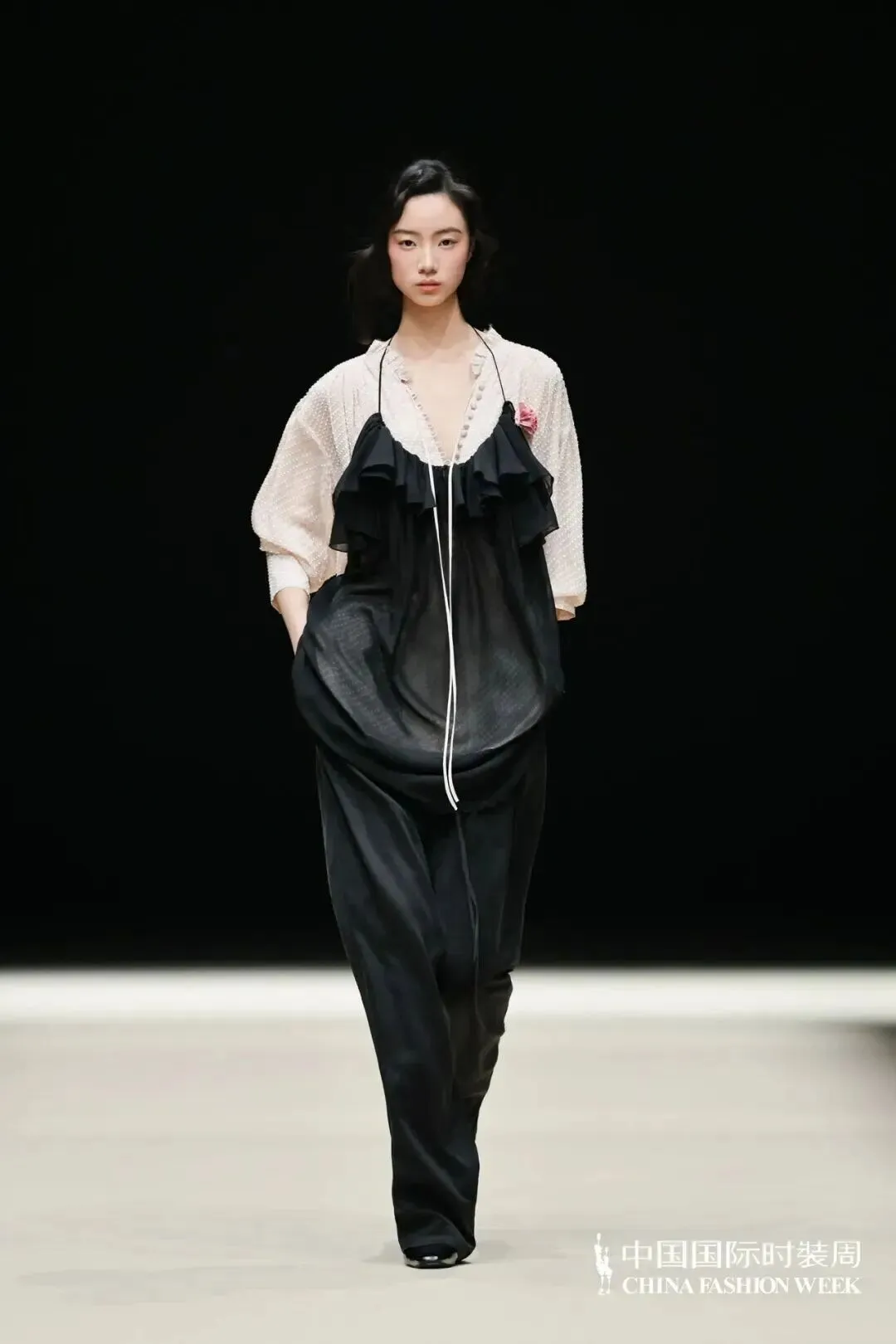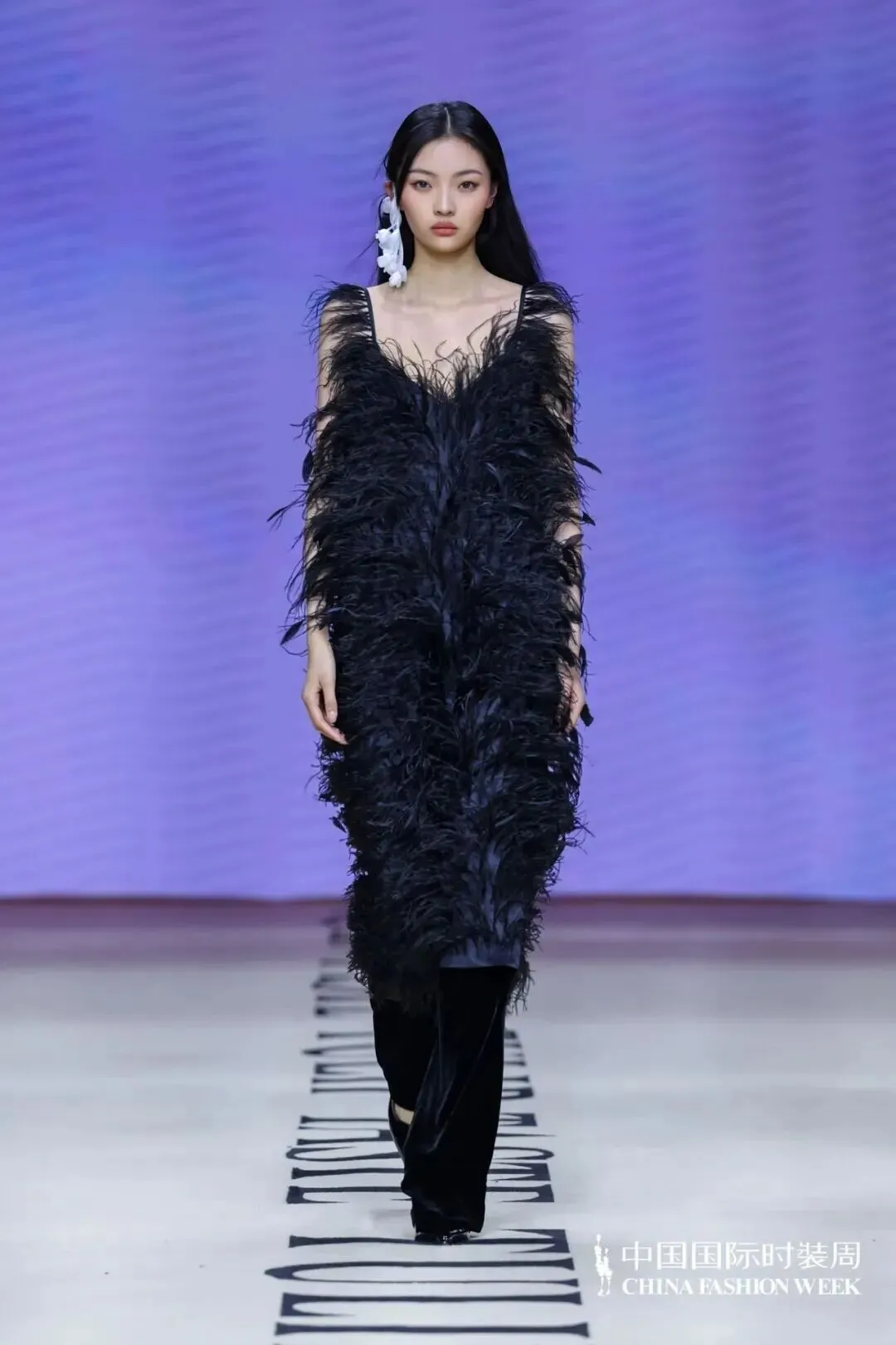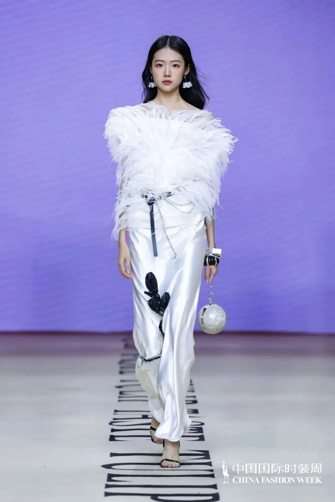 此次秀的主题为Echo Loop「回响·循环」,以“一封未寄出的信”为线索,探讨同一意图在不同时间中的多重表达。系列不强调线性递进,而是关注设计语言在流动、重组与提炼中的持续回响。工艺上注重手工感与材质的原生表达,羽毛、珠片、流苏等元素贯穿三章,形成视觉上的回响。一次确立成为轮廓,一次重复成为回声,在看似静止的结构之中,时间悄然折返;声音并未远去,它们只是以新的形态重新演绎。
