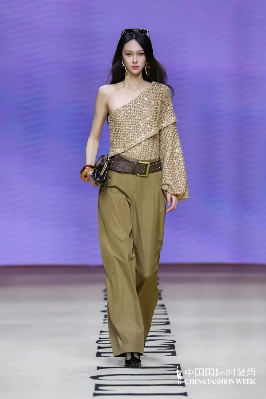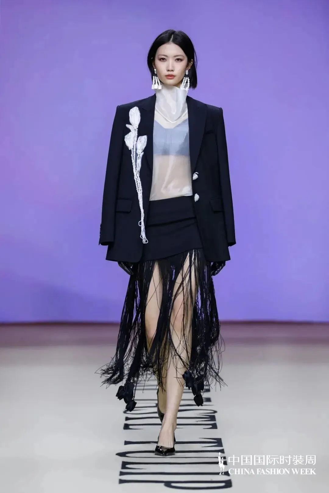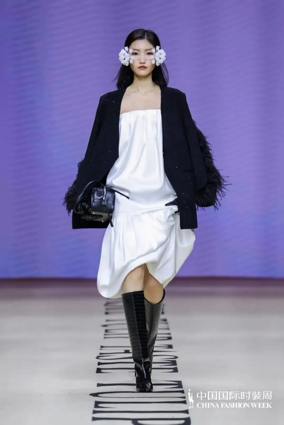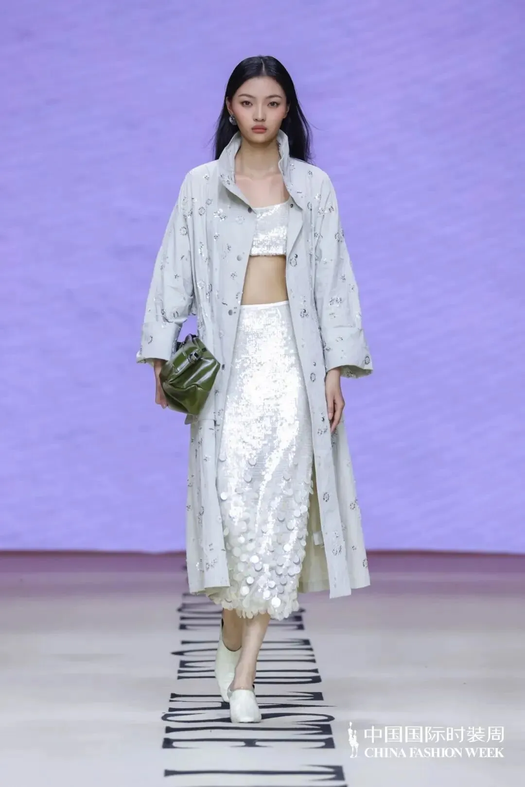 此次秀的主题为Echo Loop「回响·循环」,以“一封未寄出的信”为线索,探讨同一意图在不同时间中的多重表达。系列不强调线性递进,而是关注设计语言在流动、重组与提炼中的持续回响。工艺上注重手工感与材质的原生表达,羽毛、珠片、流苏等元素贯穿三章,形成视觉上的回响。一次确立成为轮廓,一次重复成为回声,在看似静止的结构之中,时间悄然折返;声音并未远去,它们只是以新的形态重新演绎。