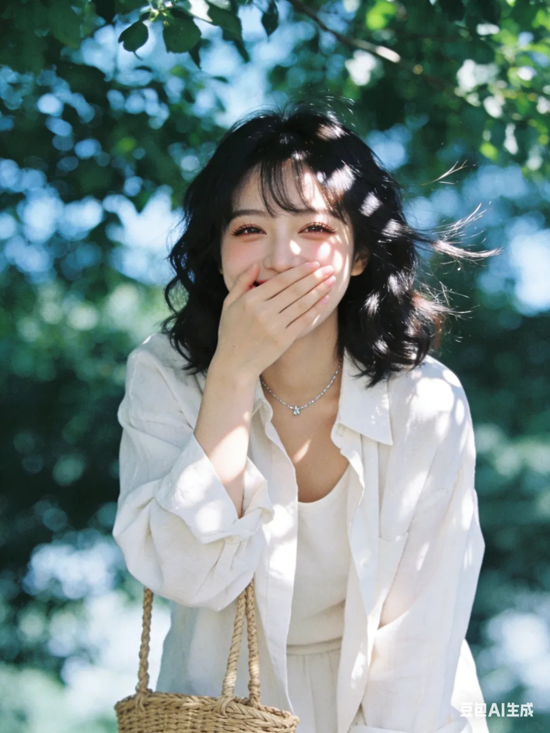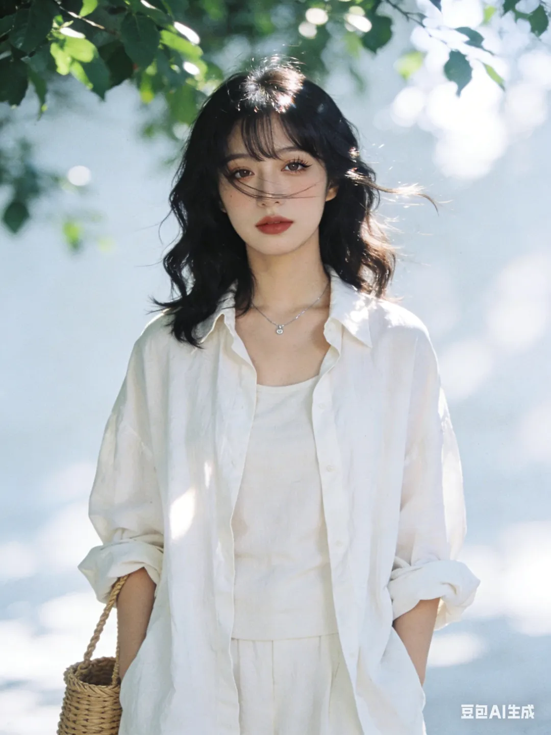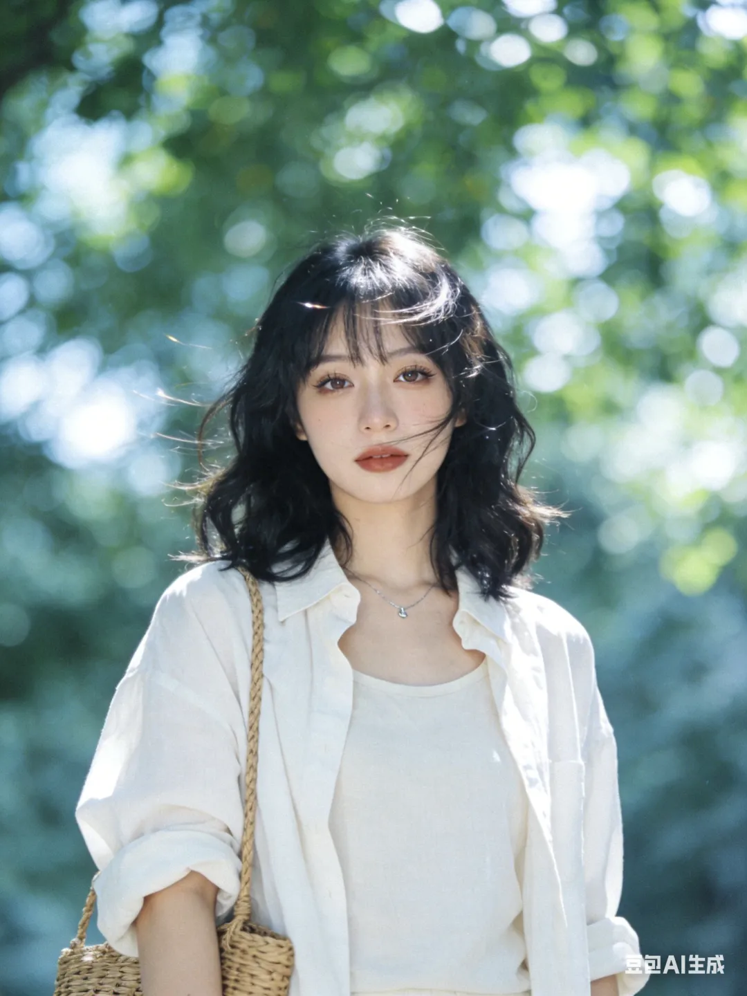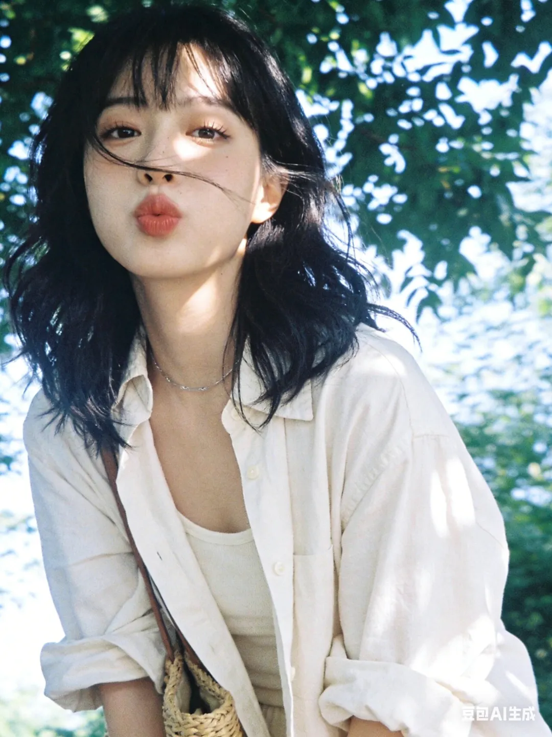 光影:自然光,微光打在发丝/脸颊,树叶投射斑驳光影,背景虚化,冷白基调;