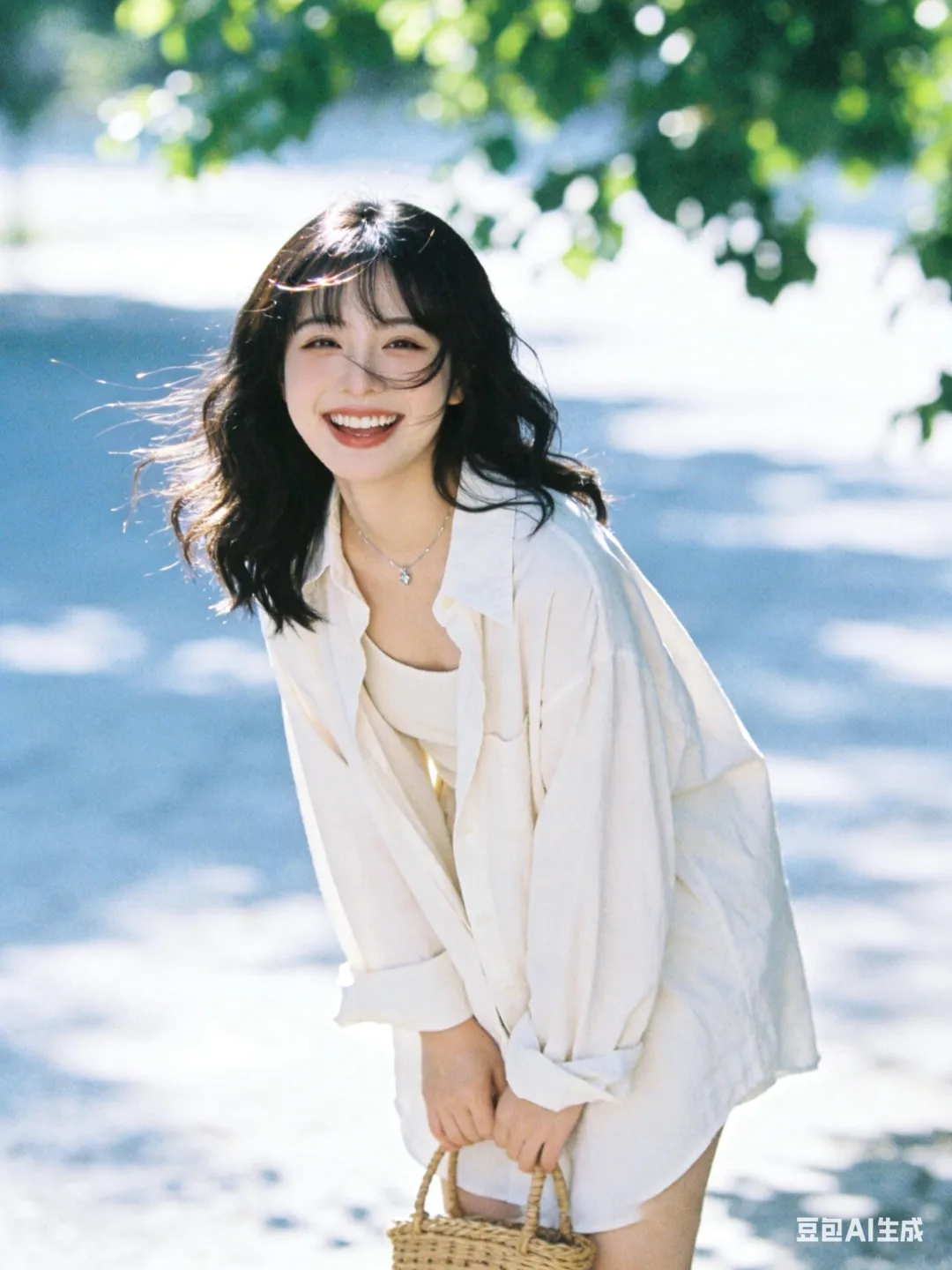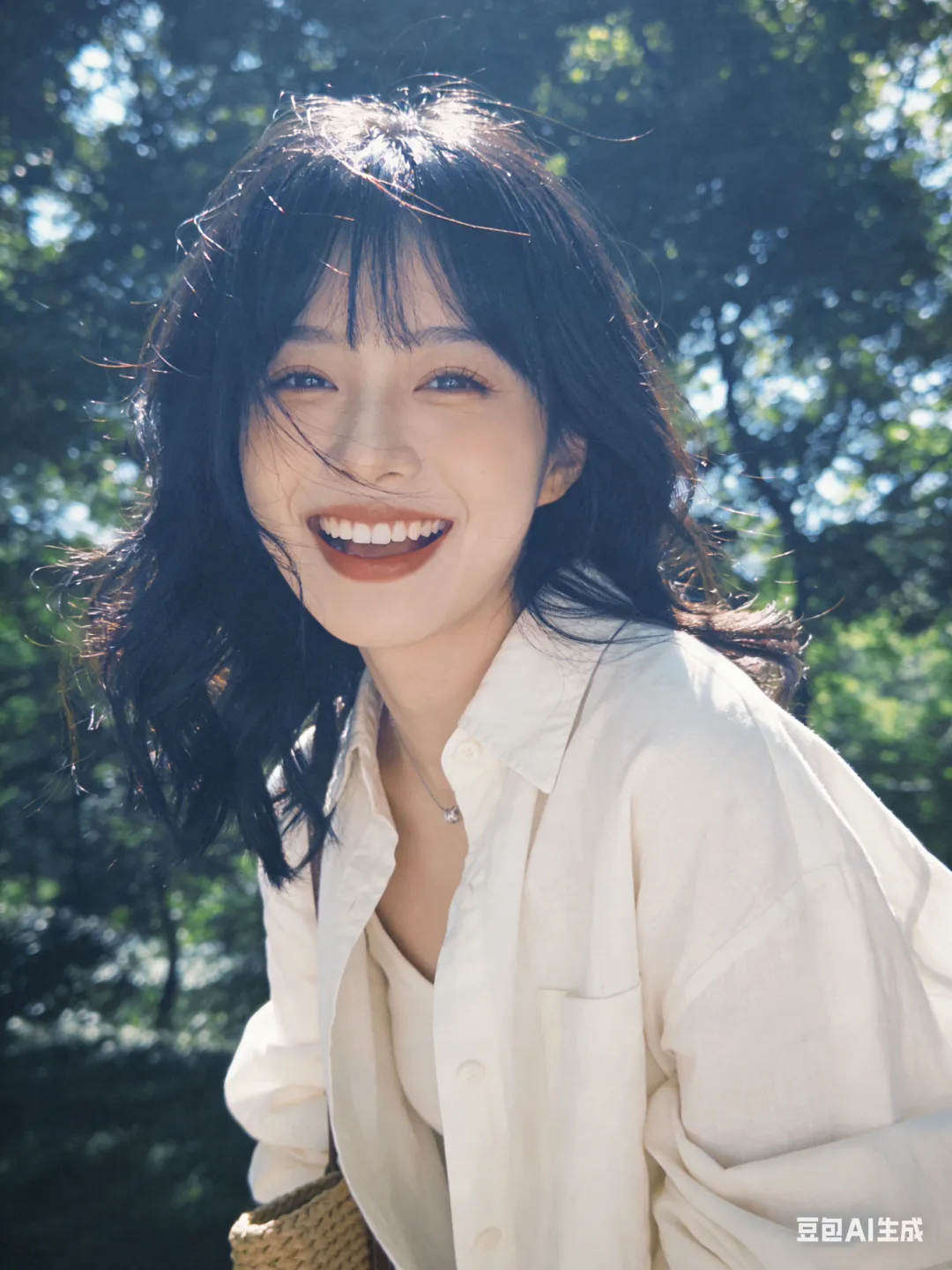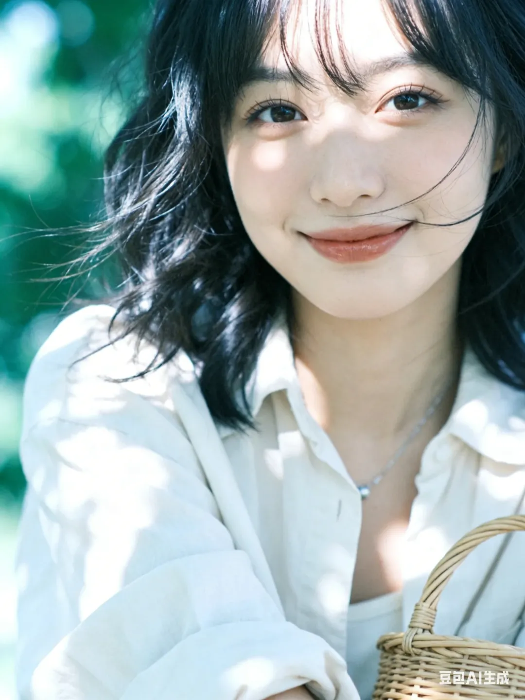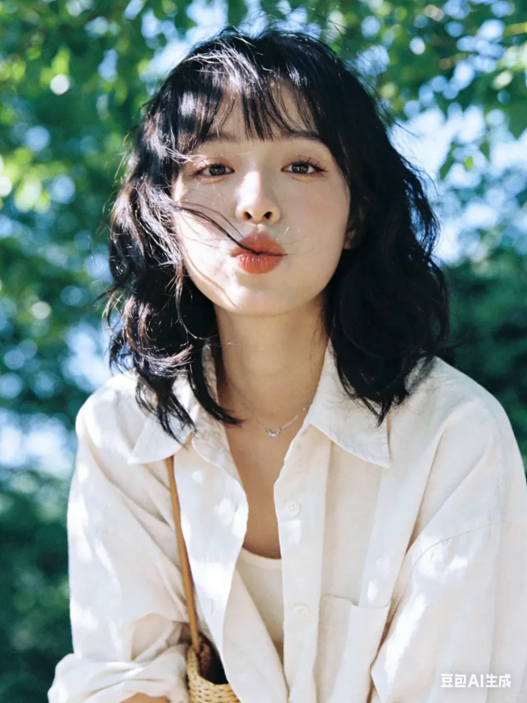 光影:自然光,微光打在发丝/脸颊,树叶投射斑驳光影,背景虚化,冷白基调;