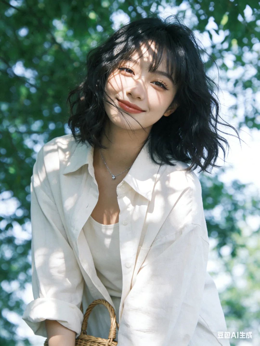 背景:夏日户外,茂密绿色树叶,绿意盎然,背景虚化突出人物主体;无过度修图,无夸张滤镜,保留本真与自然光影