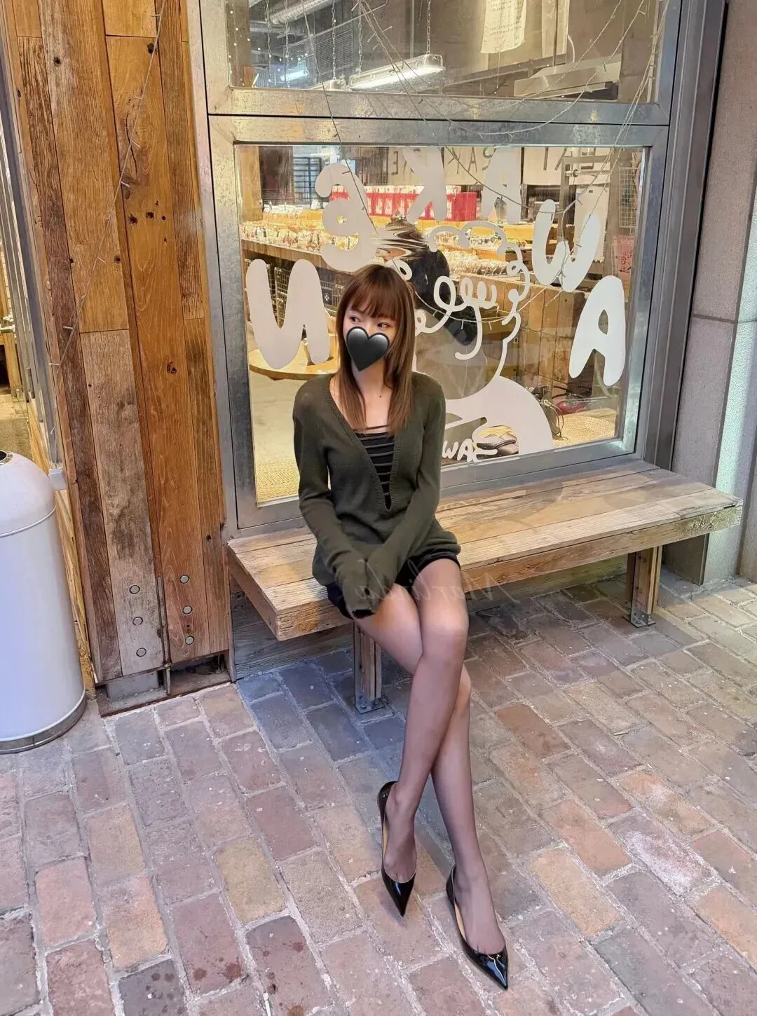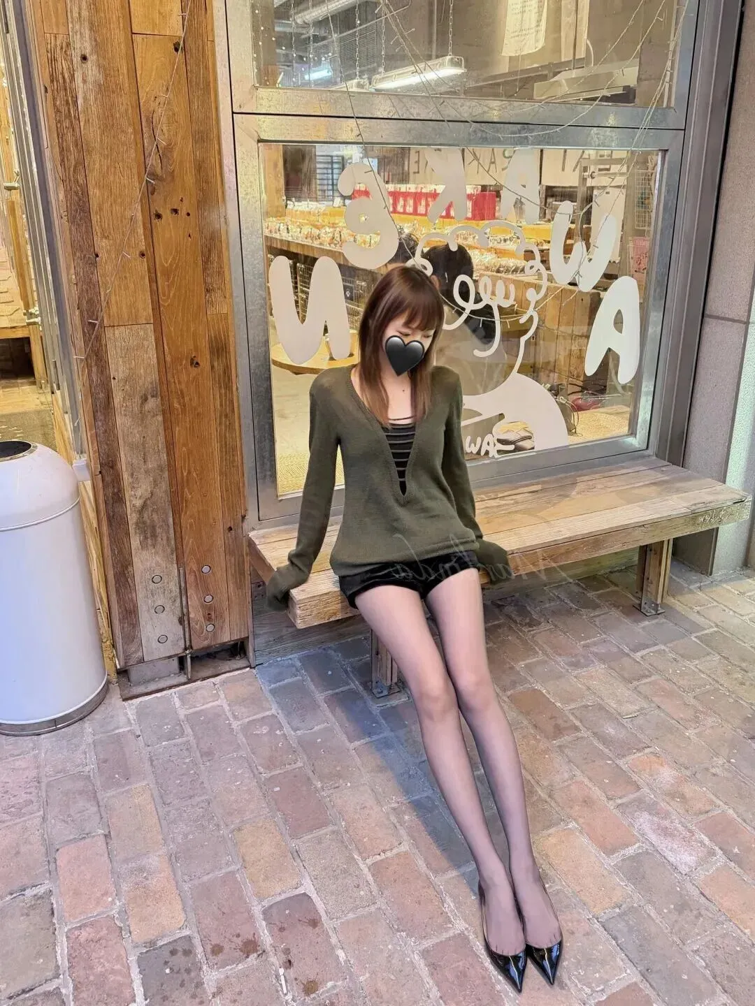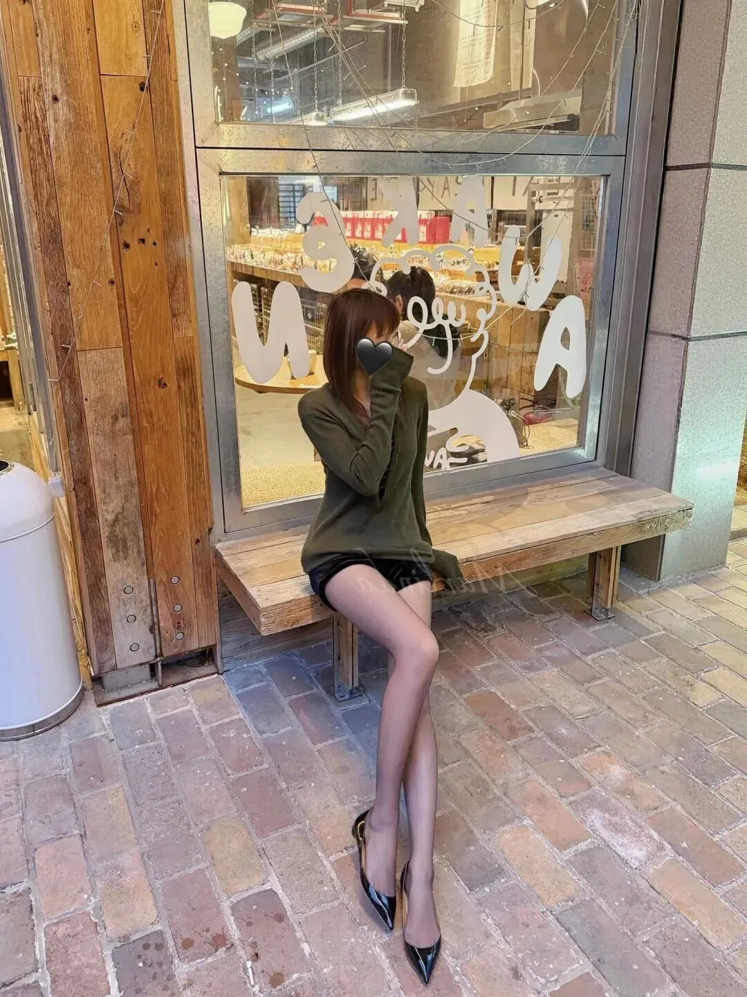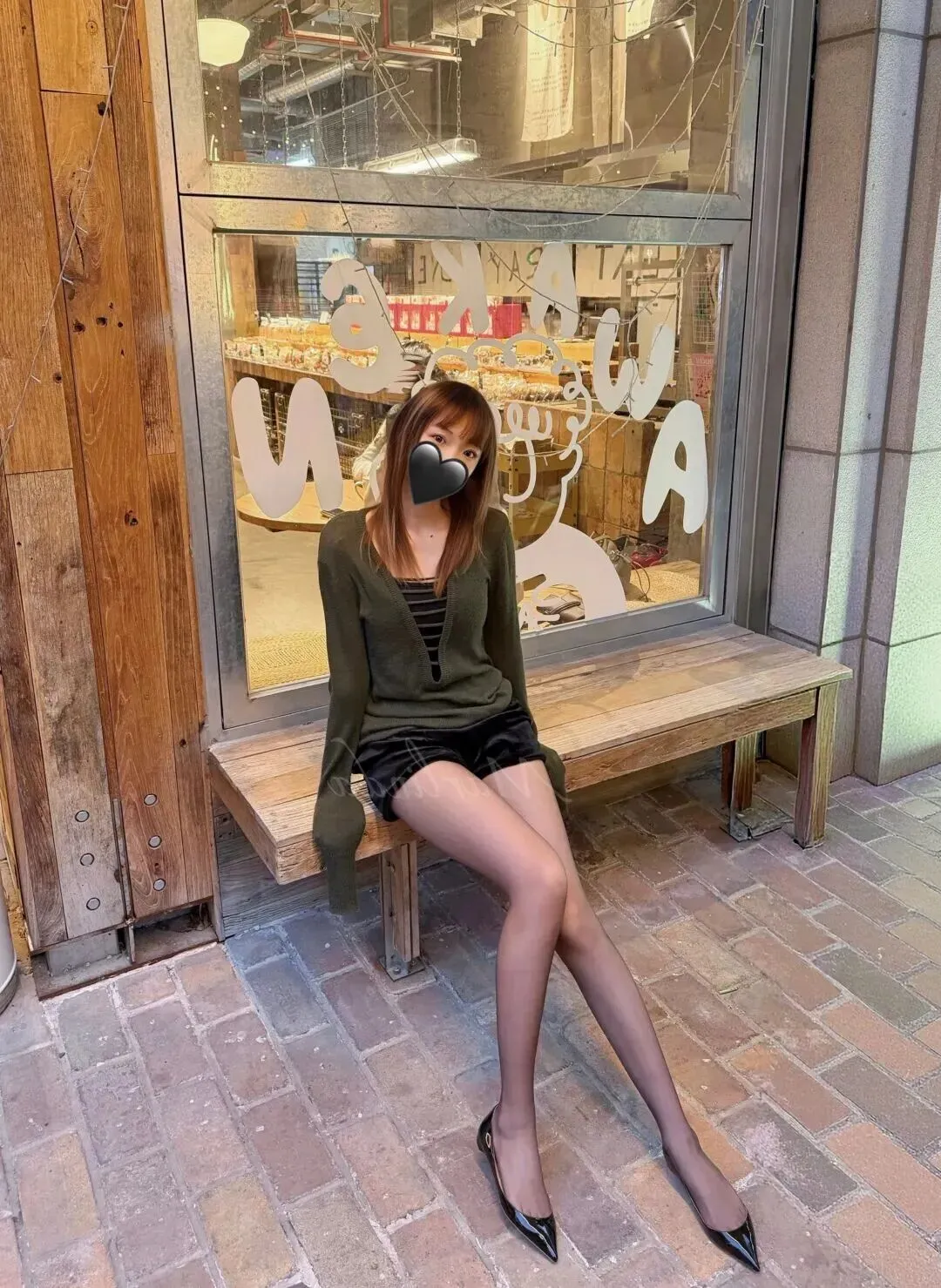 她坐在木长椅上晒太阳的时候看起来是没有精神地坐在这里的。内搭是一片黑色底色,上面用白色细线镶边。这一点条纹使一身深色有层次感,不会太闷。阳光透过玻璃照射在她的身上,整个人都暖洋洋的,非常治愈。