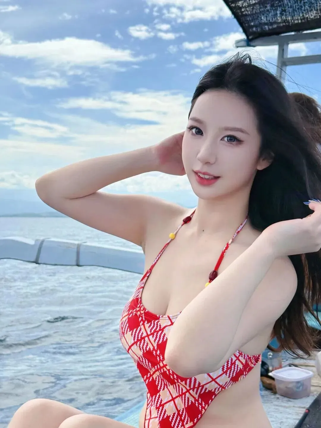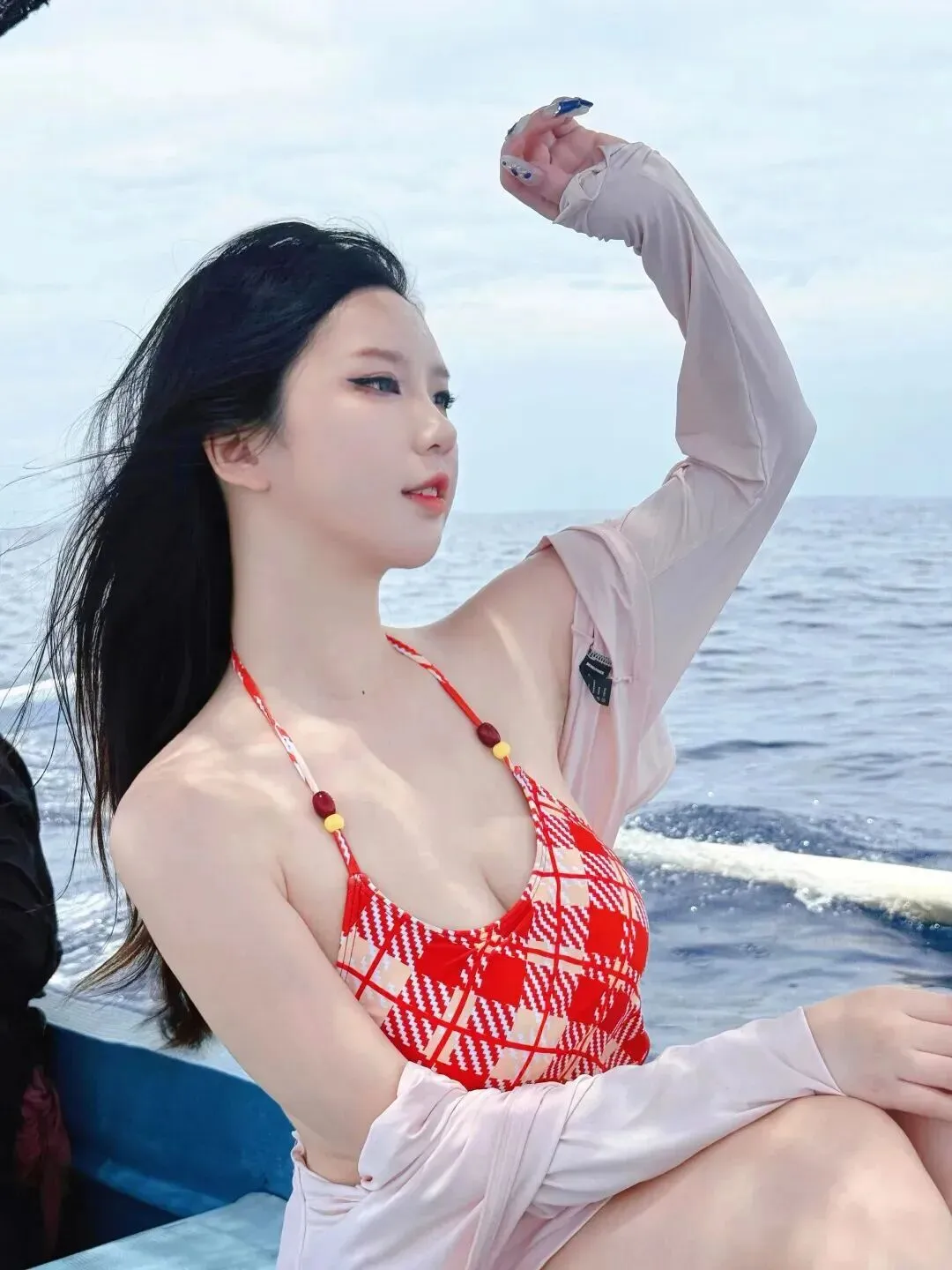 碧海蓝天配红格泳装,美女海边穿搭太吸睛