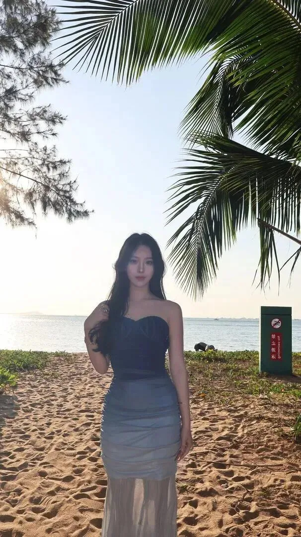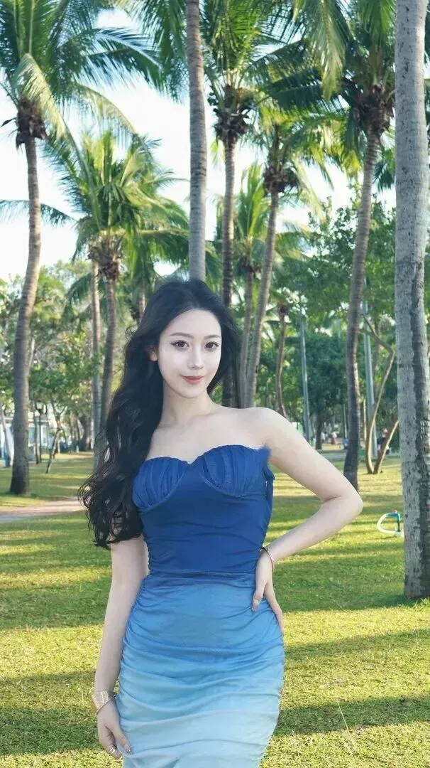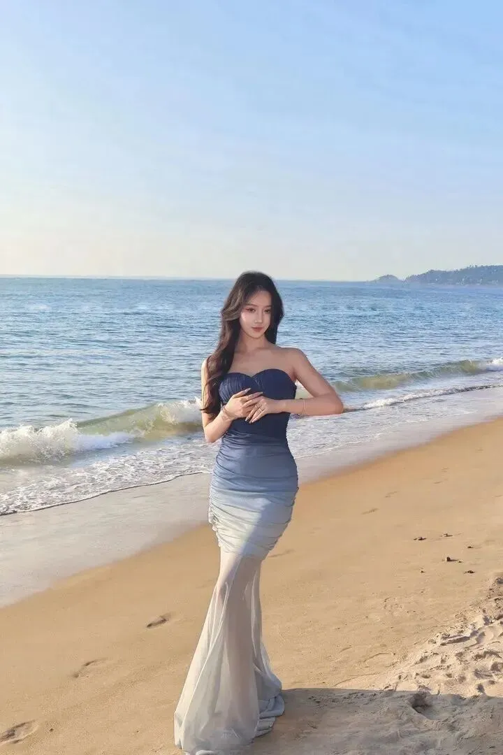 夕阳西下,天空变成了金黄色,海面上闪着光,这时穿什么最应景呢?渐变抹胸长裙就对了。裙子由藏蓝色变成浅灰色,像夕阳的颜色一样温柔。少女坐在沙滩上姿态庄重威仪、大方俊美,手指无尘、手上光彩熠熠的有宝石、有金银器。她轻轻一抬手的时候,整个人就显得很安静。这样搭配更适合晚上散步或者晚餐,人群之中更显柔美。