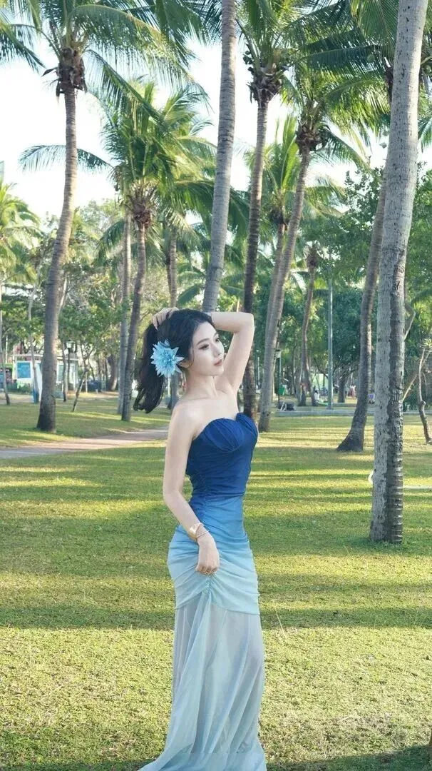 走入一片热带雨林,到处都是绿油油的棕榈树,阳光从树叶的缝隙中穿出来,美得就像一幅画一样。一个小姑娘穿着越来越深色的蓝色大裙子,在风中飘动着就像树林里的精灵一样。抹胸部分为藏蓝色,逐渐变浅成浅灰蓝,神秘而又自然。她的头发扎起一束别上一个小花,非常清新。她站那里时,手轻轻放在后面,似乎在和大自然私语。这样的穿着太适合在森林、公园里穿了,灵动、可爱,与大自然完美融合。
