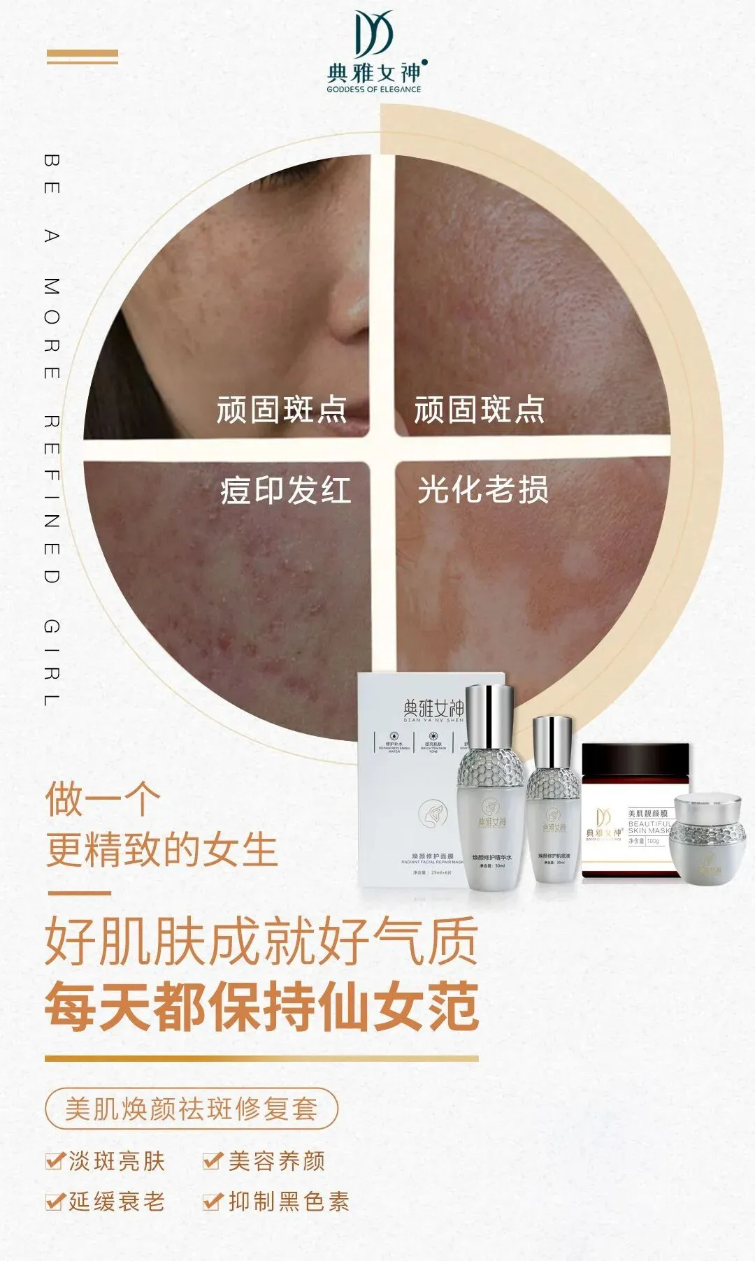 典雅女神美肌焕颜祛斑修复套,是专攻 “顽固斑点 + 痘印发红 + 光化老损” 的综合修护套组,精准适配被这些肌肤问题拖累气质的人群,主打 “好肌肤成就好气质,每天保持仙女范”,不用拆分叠加多类产品,就能一站式实现淡斑、修护、抗老的精致肤质蜕变。