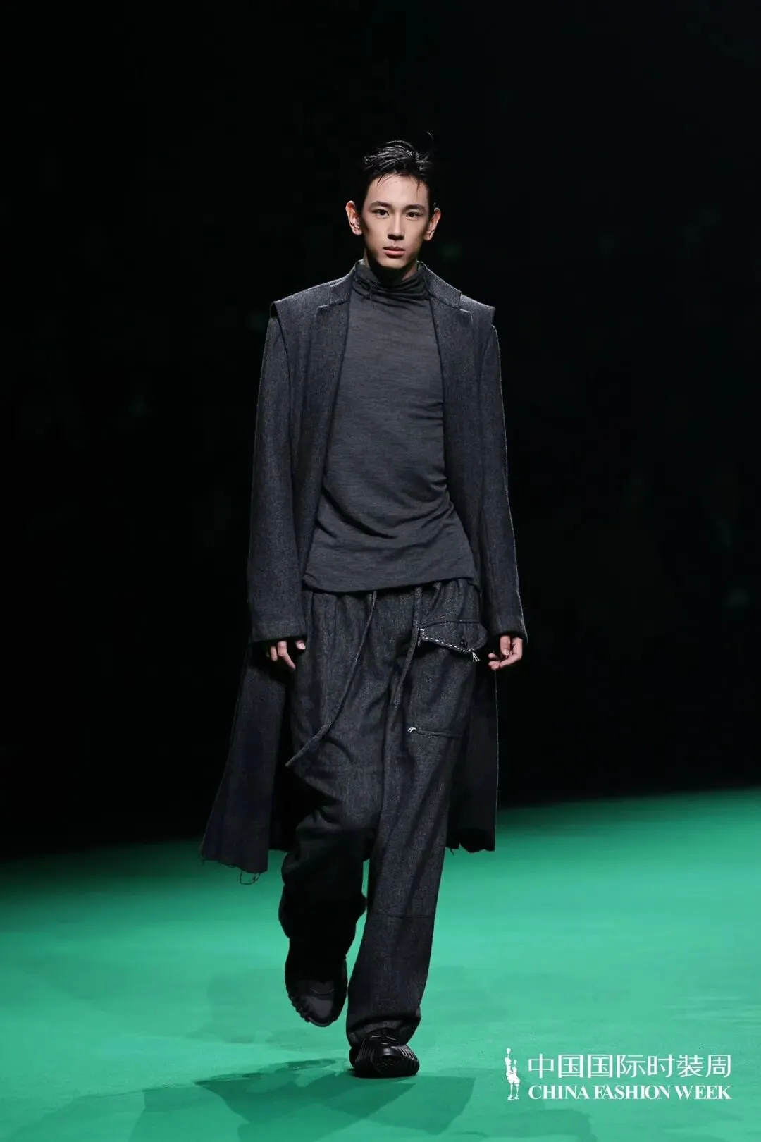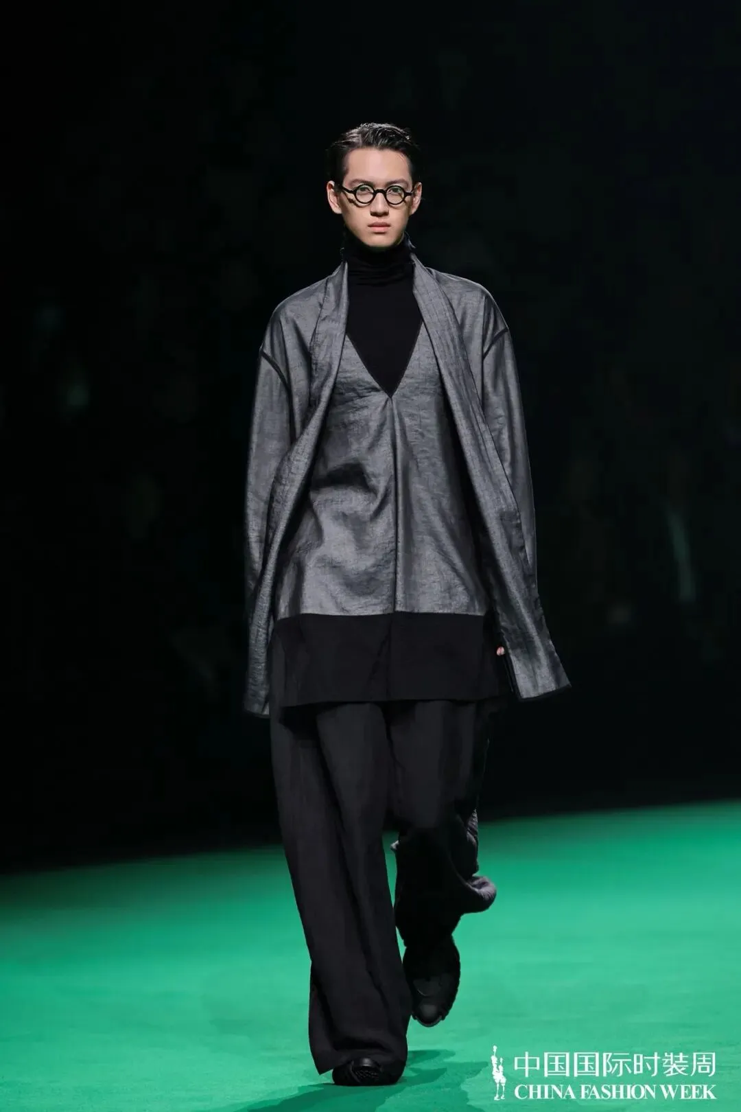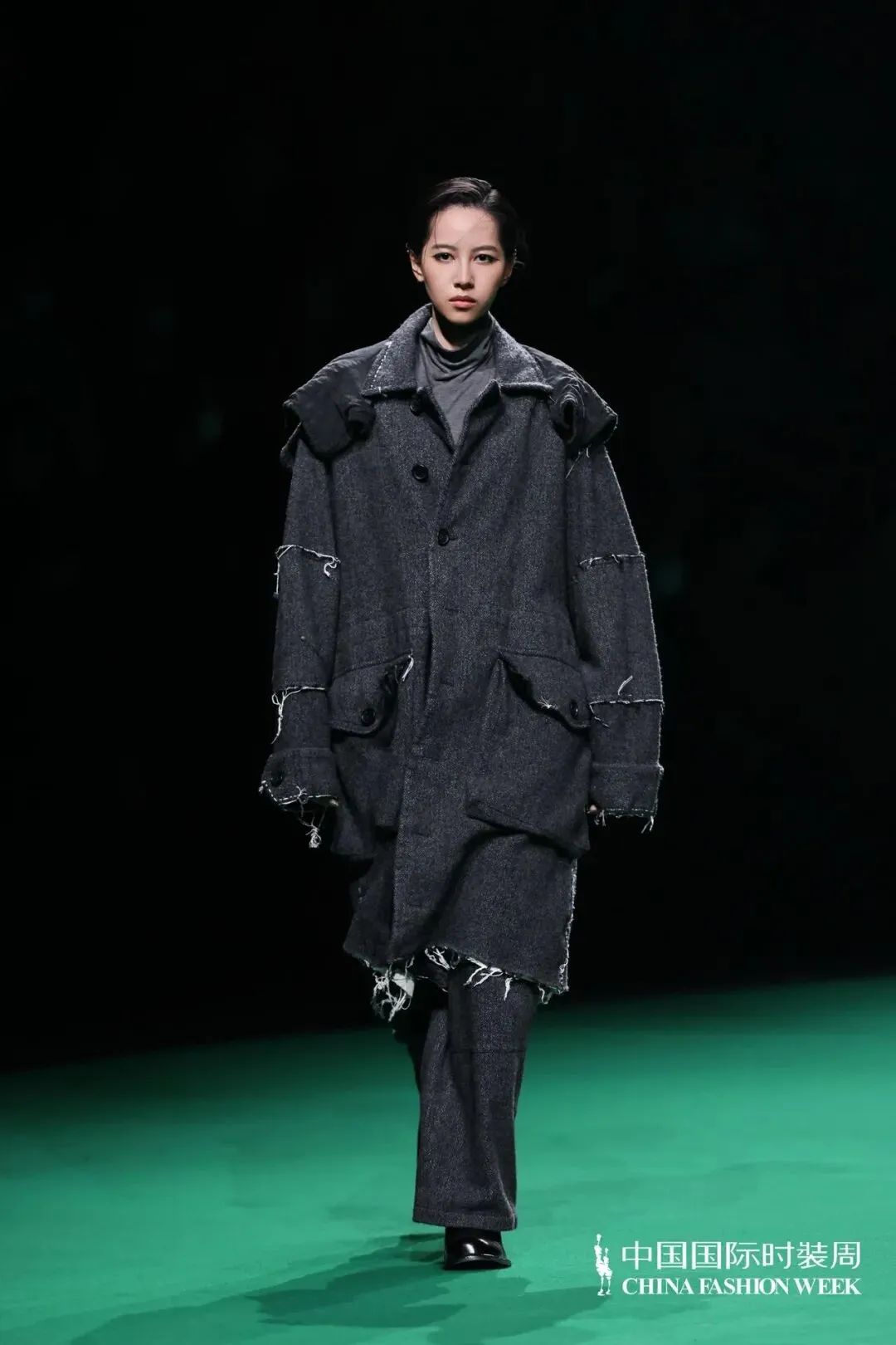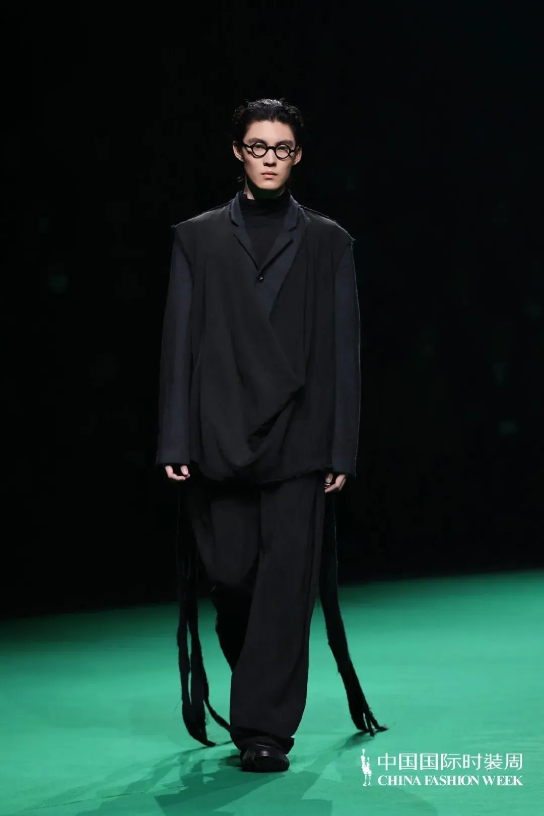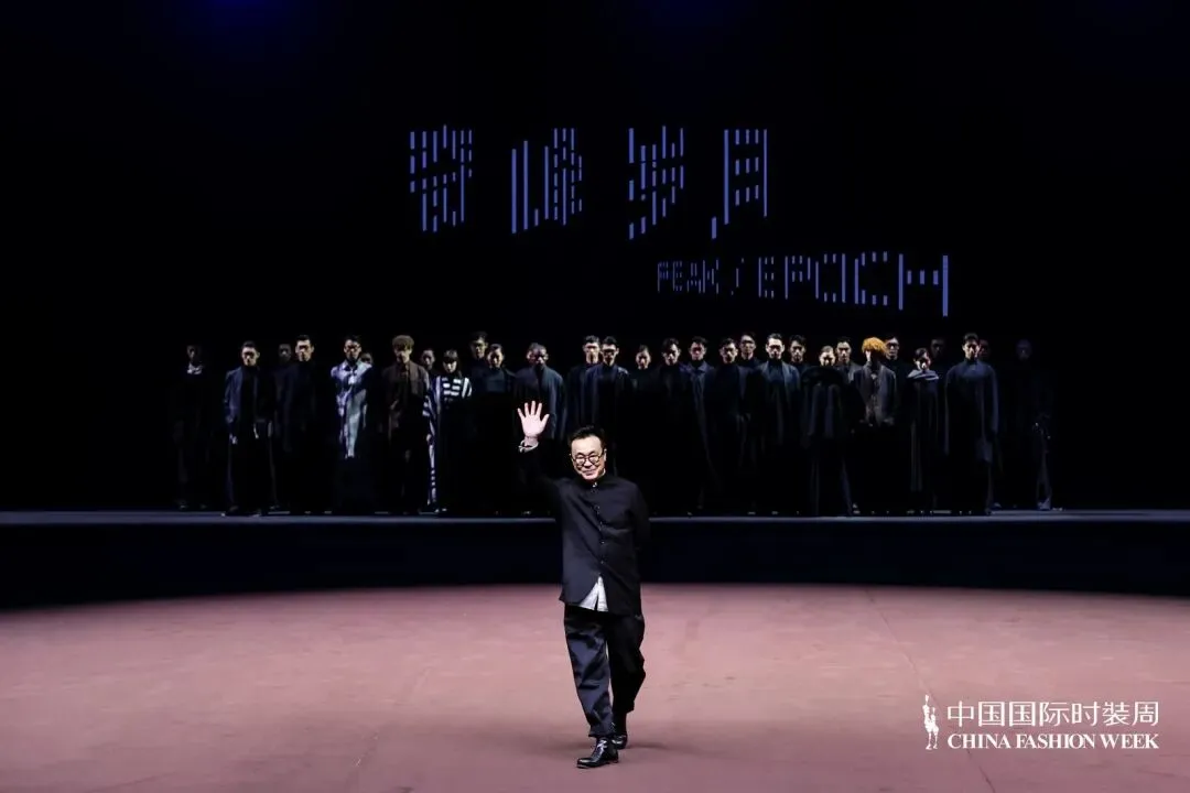 本次作品发布会主创设计师为北京服装学院副院长、教授、博士生导师邹游,以“奇峰岁月Peak/Epoch”为主题,探讨服装作为时间媒介所镌刻的美学线条。大秀将20世纪西方早期设计师与中国文人的形象并置,使不同空间的知识分子着装风格在形式结构与审美意韵上形成映照与对话。设计团队打破服装固有款式结构,强化内外、上下层次的穿插关系,并融合绗缝、毛边等传统工艺,将20世纪初的现代性转化为可感知的时代气质与穿着情绪。