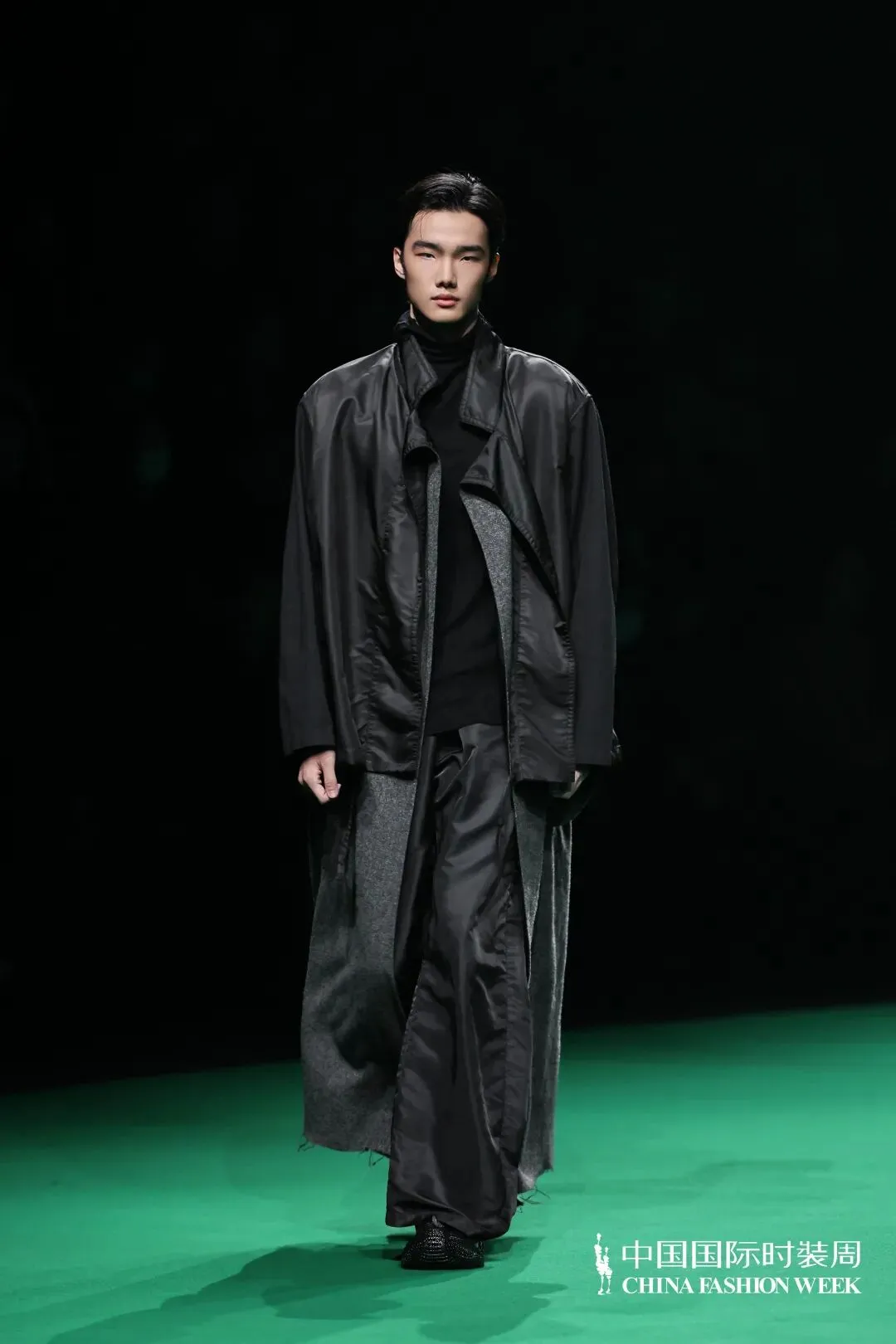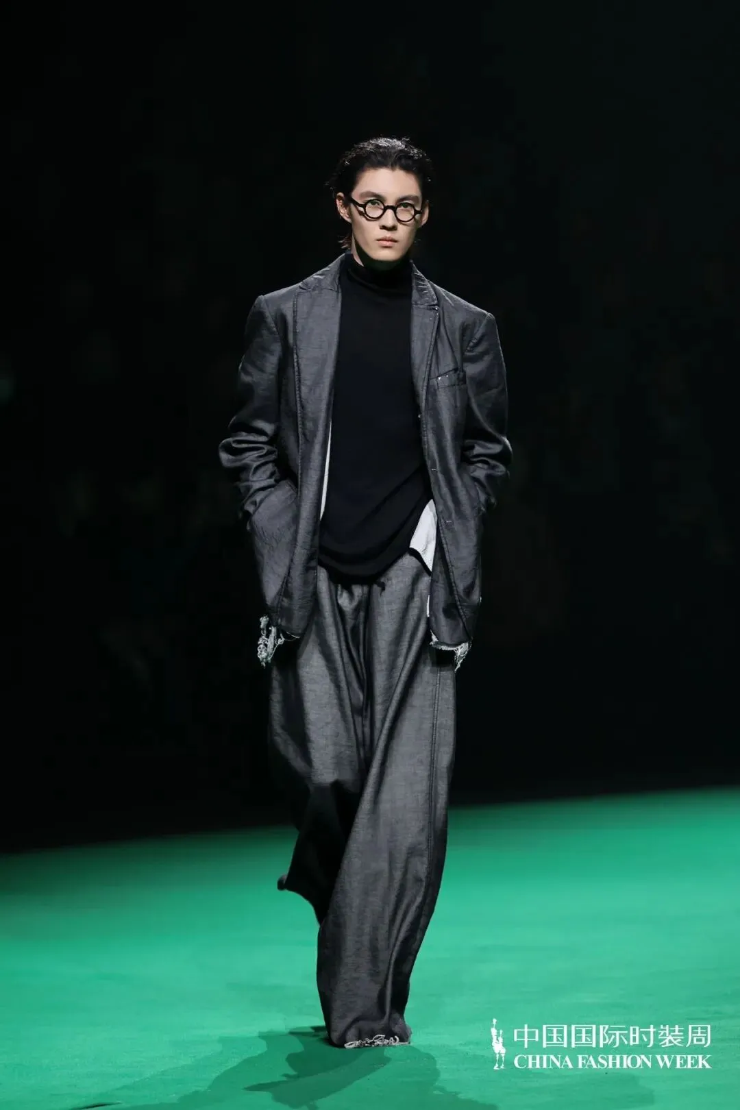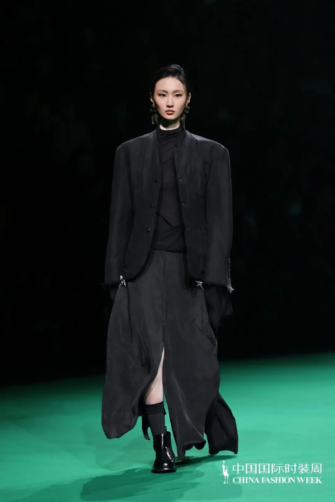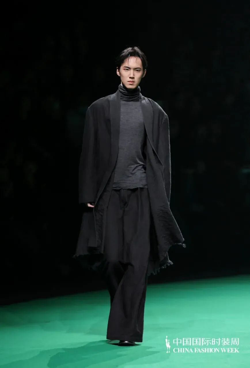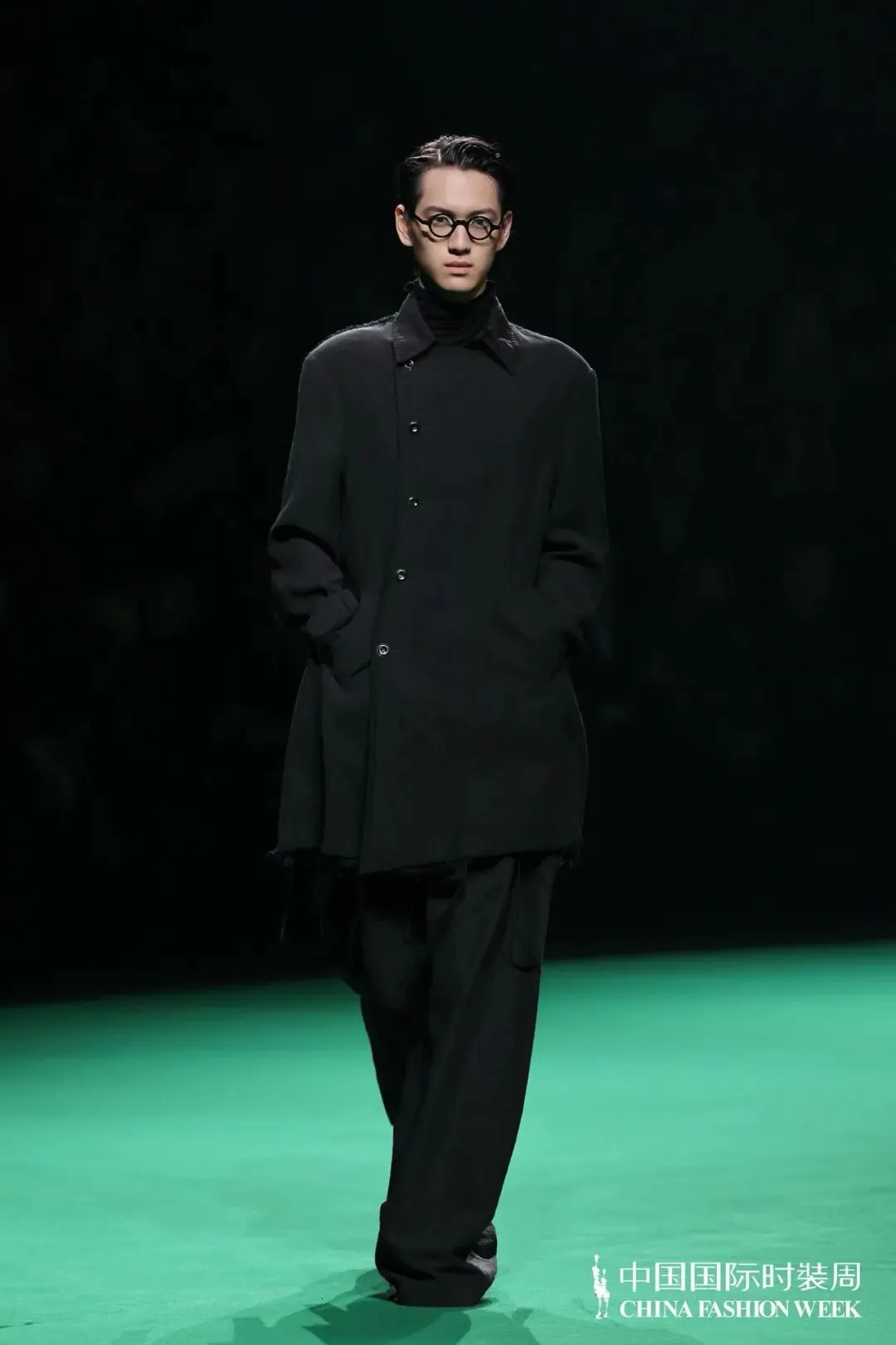 本次作品发布会主创设计师为北京服装学院副院长、教授、博士生导师邹游,以“奇峰岁月Peak/Epoch”为主题,探讨服装作为时间媒介所镌刻的美学线条。大秀将20世纪西方早期设计师与中国文人的形象并置,使不同空间的知识分子着装风格在形式结构与审美意韵上形成映照与对话。设计团队打破服装固有款式结构,强化内外、上下层次的穿插关系,并融合绗缝、毛边等传统工艺,将20世纪初的现代性转化为可感知的时代气质与穿着情绪。