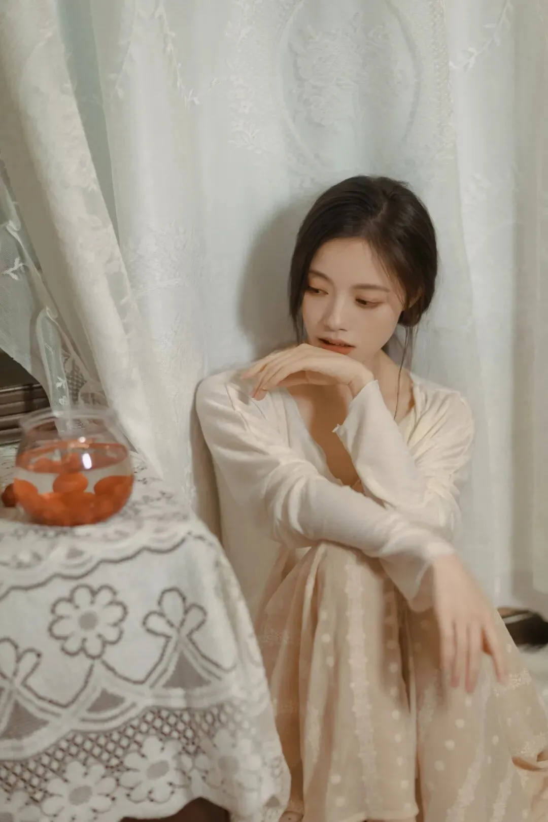▲"你就抱膝坐在地上,放松就好" → 拍到了白纱帘前最放松的一张