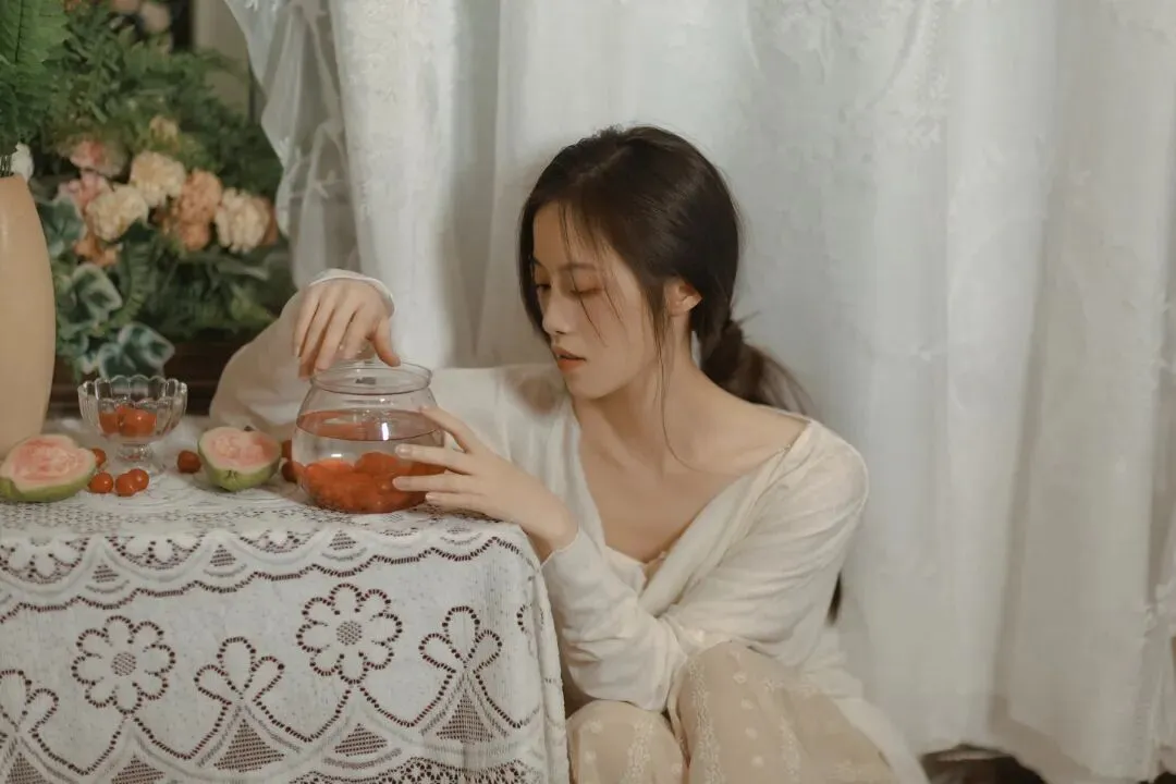 记住一个原则:衣服的颜色不要超过三种,最好和场景主色调统一。居家写真不是时装大片,和谐比亮眼重要。