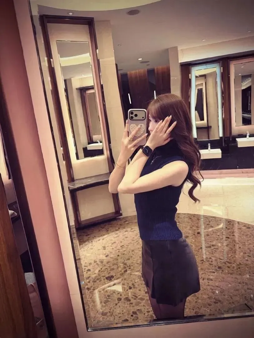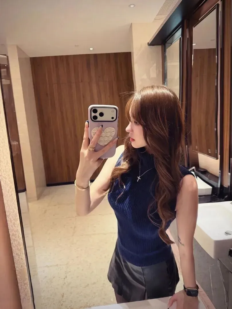 先讲总体效果。在自拍的角度下,她对着镜子做穿搭的记录,那一种随性感非常的真实。深蓝色无袖高领毛衣将上身的轮廓变得更加紧密,脖子变长了线条更好看。下身黑色皮裙短款设计,一条蛇样地把一条腿的美丽展现在人们面前,并且还有一种女性的感觉。色彩搭配比较简单,但是高级感迎面而来。