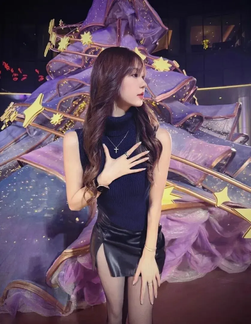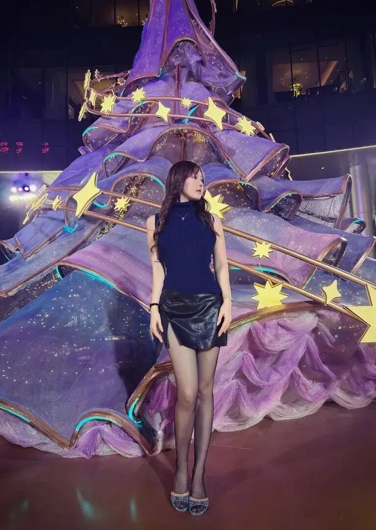 侧面视角更是绝美!在夜景下她侧颜线条清楚、高领毛衣突出颈部曲线、皮裙开叉显露出腿来。高跟鞋同丝袜配合显得性感优雅,从各个角度都经得起拍。
