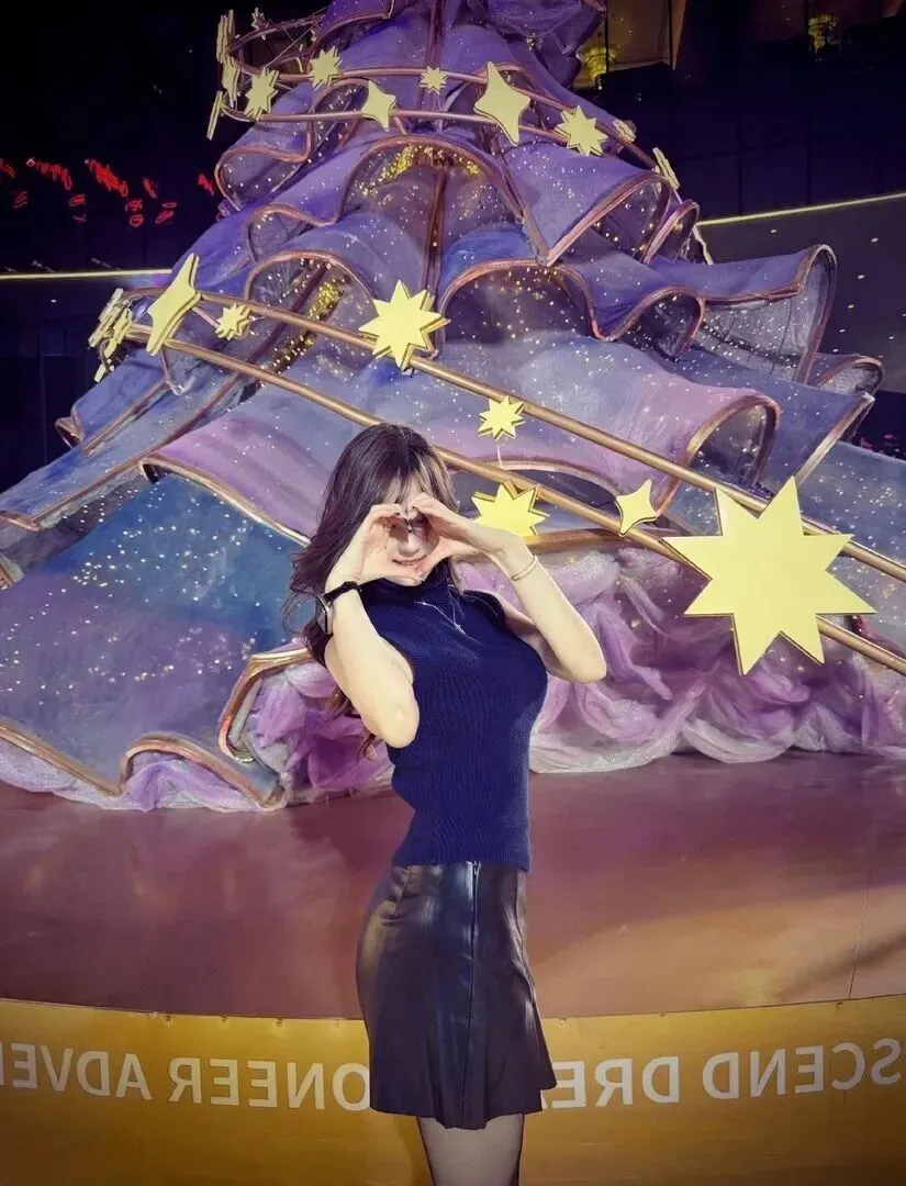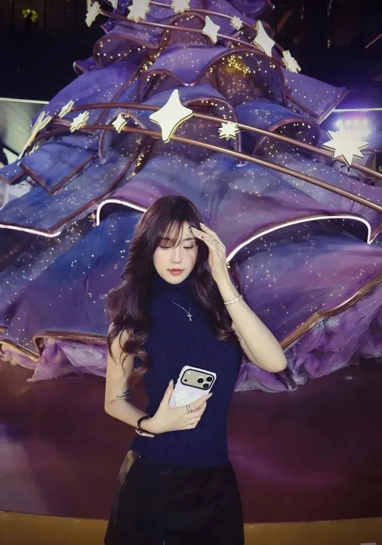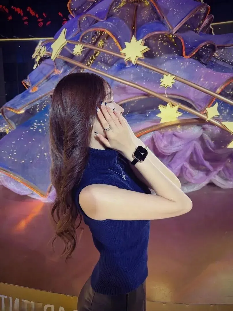 该套衣服特别适用于节日使用,背景紫色圣诞树,蓝色上衣都很符合节日的氛围,充满节日感。用手指在脸部轻碰几下,再以点点形状在脸部轻轻移动着,这时一个女孩的美与神秘更加突出。拍照时选择背景合适,氛围感就出来了。