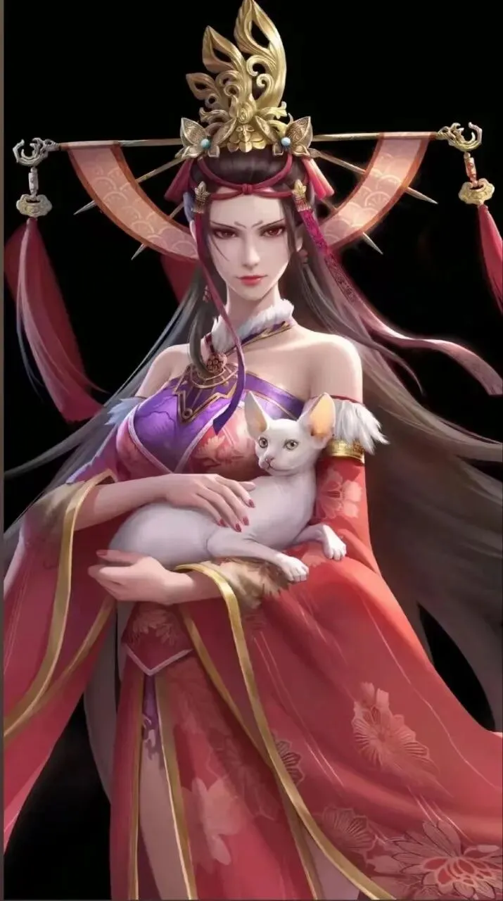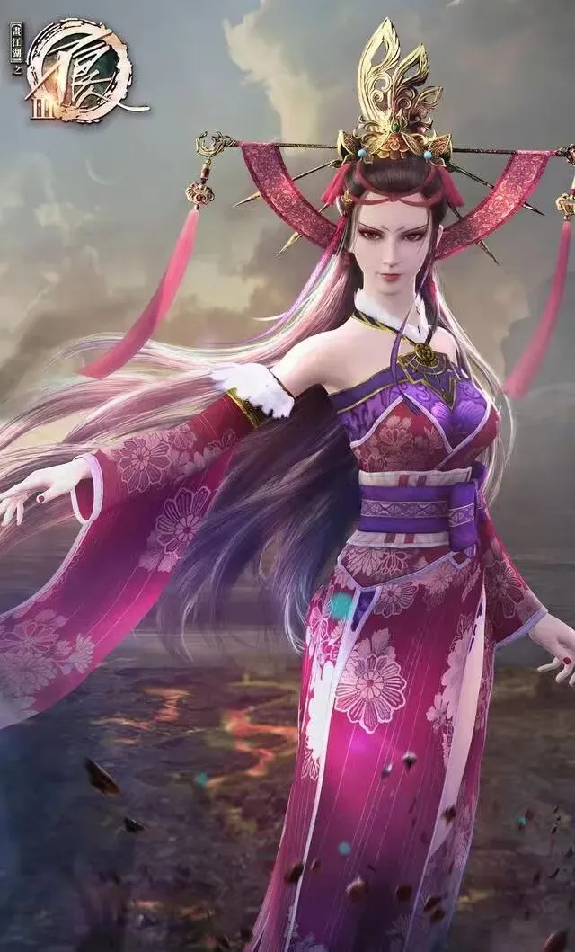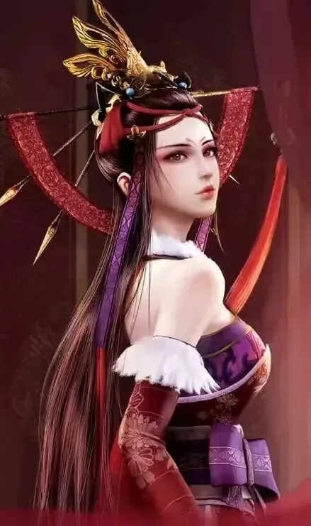 女装形态:当她以女帝身份出现时,堪称绝色。她身材高挑,鹅蛋脸庞,红绳抹额,高盘发髻,缀满长直金凤冠对钗,后垂一缕发束,造型华丽高贵。