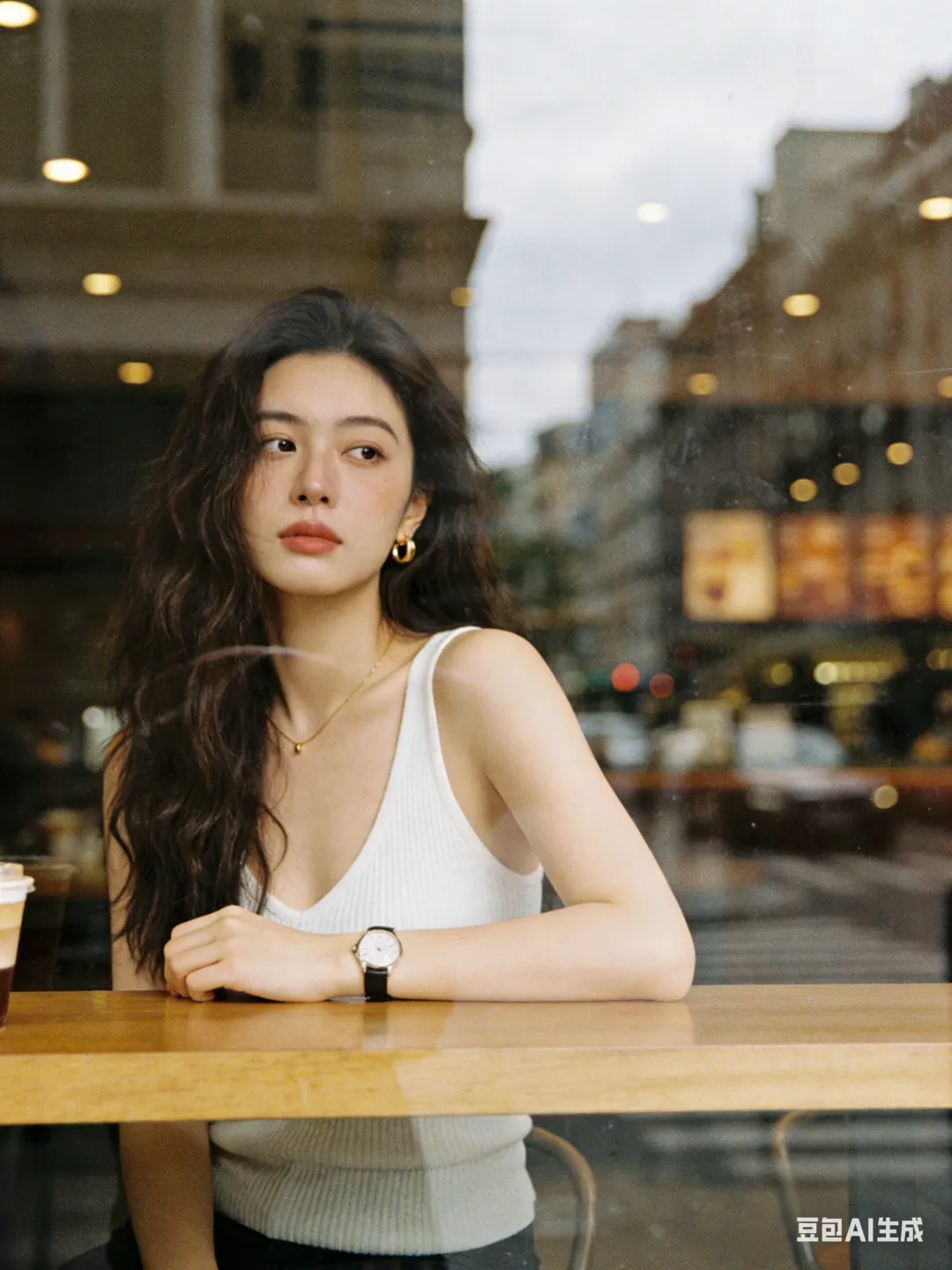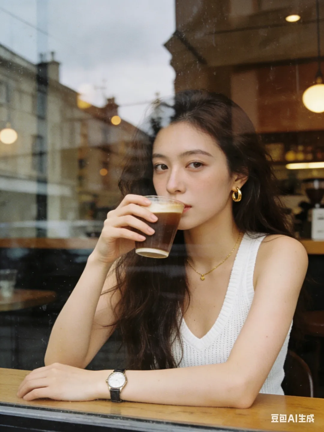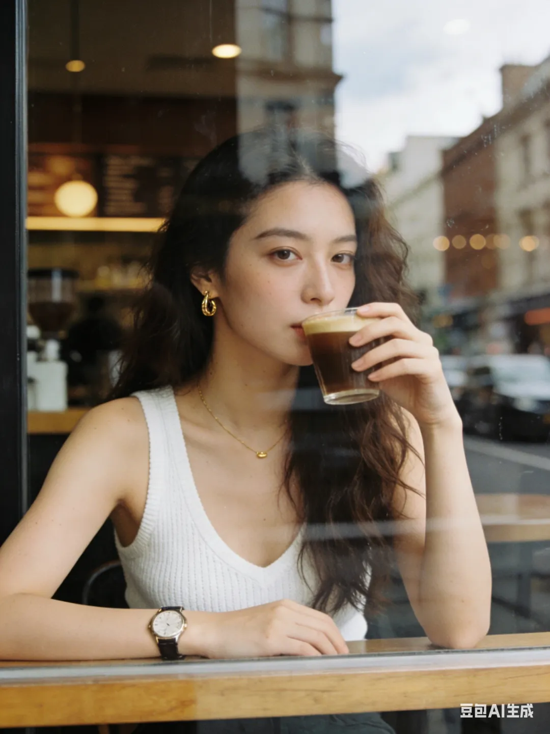 环境:透过咖啡馆临街玻璃橱窗拍摄的一张女性肖像照片,人物坐在吧台前,前面是一大块落地玻璃窗,玻璃表面带有街道和城市建筑反射影像,不要有大面积天空。 室内照明为暖色调。主光源自然光,人物面部受光均匀,没有明显阴影。背景为咖啡馆内部环境,完全虚化为柔和的咖啡色和棕色光斑。 整体安静克制、抓拍感,高级氛围。