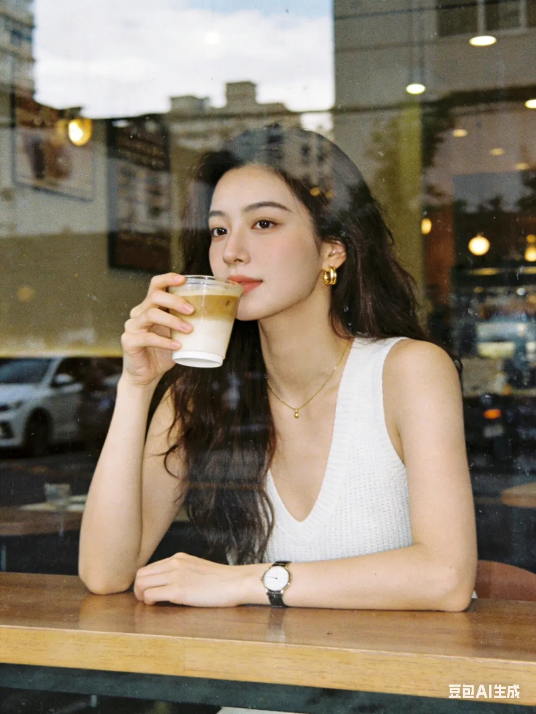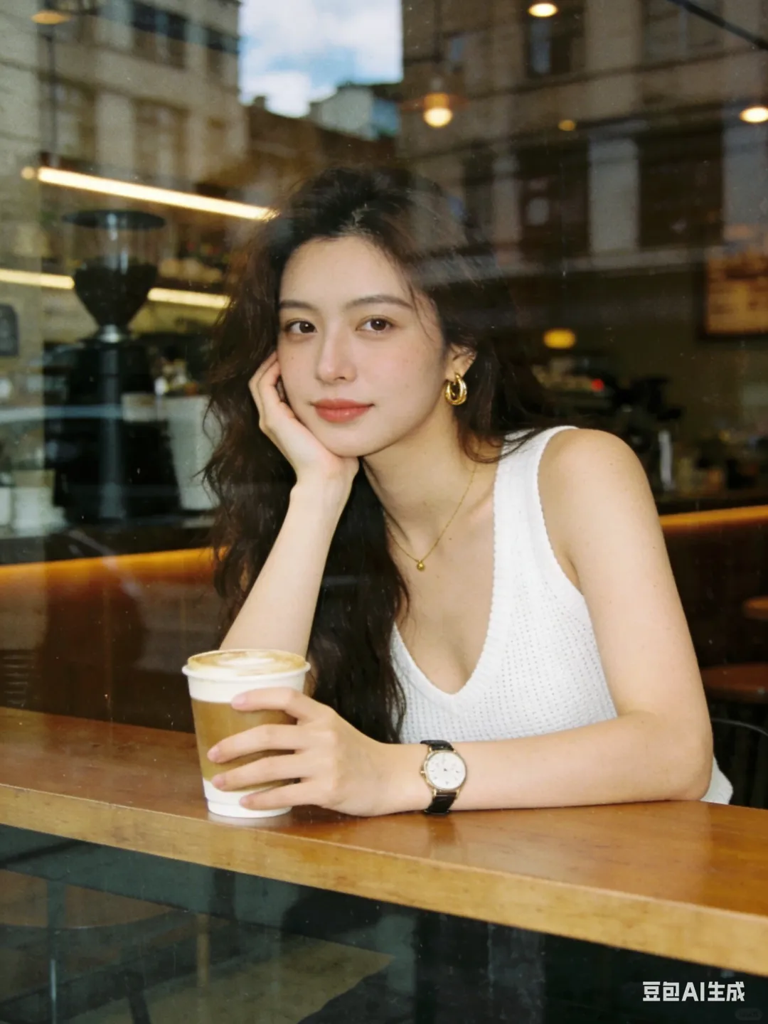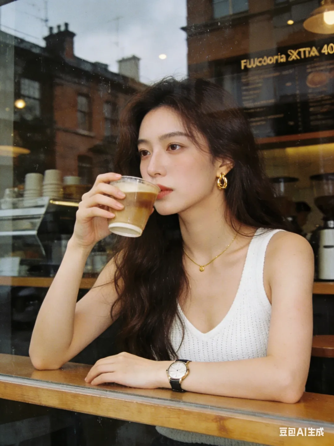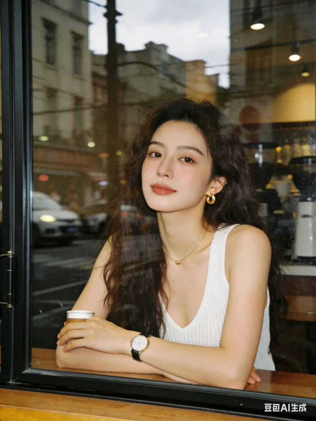 环境:透过咖啡馆临街玻璃橱窗拍摄的一张女性肖像照片,人物坐在吧台前,前面是一大块落地玻璃窗,玻璃表面带有街道和城市建筑反射影像,不要有大面积天空。 室内照明为暖色调。主光源自然光,人物面部受光均匀,没有明显阴影。背景为咖啡馆内部环境,完全虚化为柔和的咖啡色和棕色光斑。 整体安静克制、抓拍感,高级氛围。