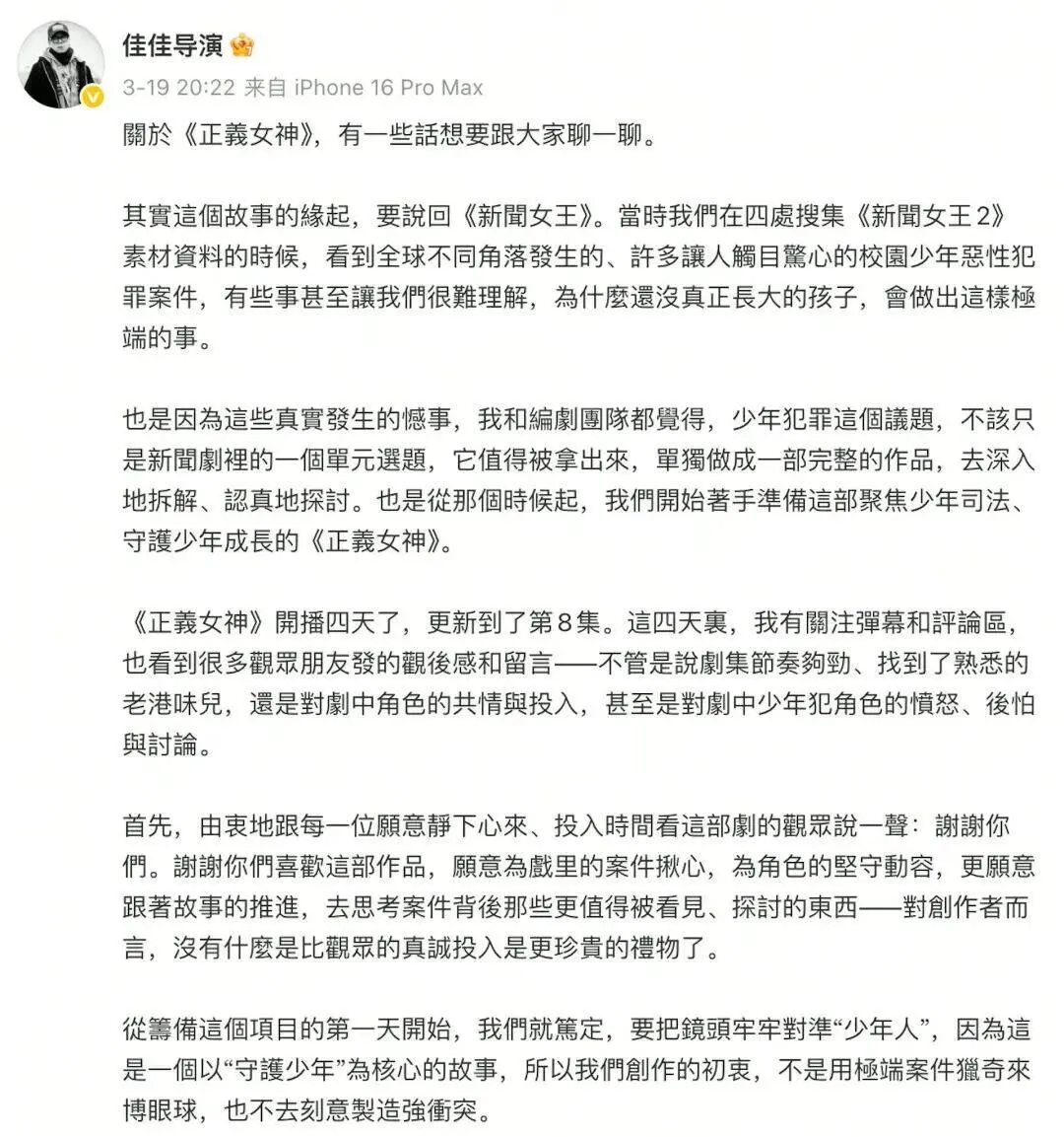 钟澍佳在长文中首先表示,自己一直密切关注剧集的弹幕与评论,看到观众为剧中案件揪心、为角色坚守动容,深感创作的价值所在。他坦言,正是希望让观众看懂剧集的真正内核,才决定公开创作初衷,回应抄袭争议。据钟澍佳透露,《正义女神》的创作灵感,并非源自韩剧《少年法庭》,