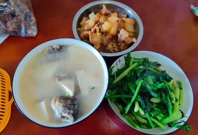 中午我本来想“奖励”自己一份重油重辣,手已经点开外卖软件了,又想起那位阿姨在车上那种不急不躁的坐姿。于是改成一桌“看着就很家常”的饭:一碗鱼汤白得像雾,豆腐吸满了汤,入口滑,后味带点鲜;炒青菜油不多,脆嫩还带着锅气;还有一碗土豆炖肉,土豆被炖得粉,肉香不冲,暖胃。真正的克制,不是忍,是选择不让自己过度。