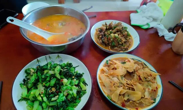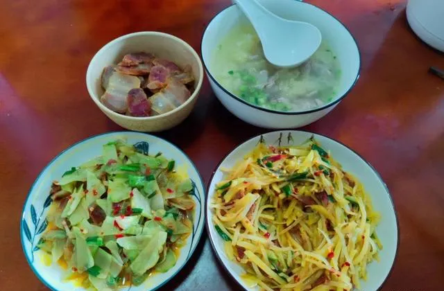 后来我发现,最容易让人发胖的不是饭,是“凑合”的心态:困了就靠奶茶顶,烦了就靠炸鸡哄,开心也吃,难过也吃。可一旦你认真坐下来,哪怕只是粥配两盘小菜,味觉会慢慢回到正常。咸肉切得薄薄的,带点烟熏香;清炒的菜叶子微微发亮,辣椒碎点在上面,刺激但不霸道;一盘土豆丝酸辣开胃,嚼起来脆,嘴巴忙了,脑子反而安静。很多时候我们想要的不是饱,是被照顾的感觉。