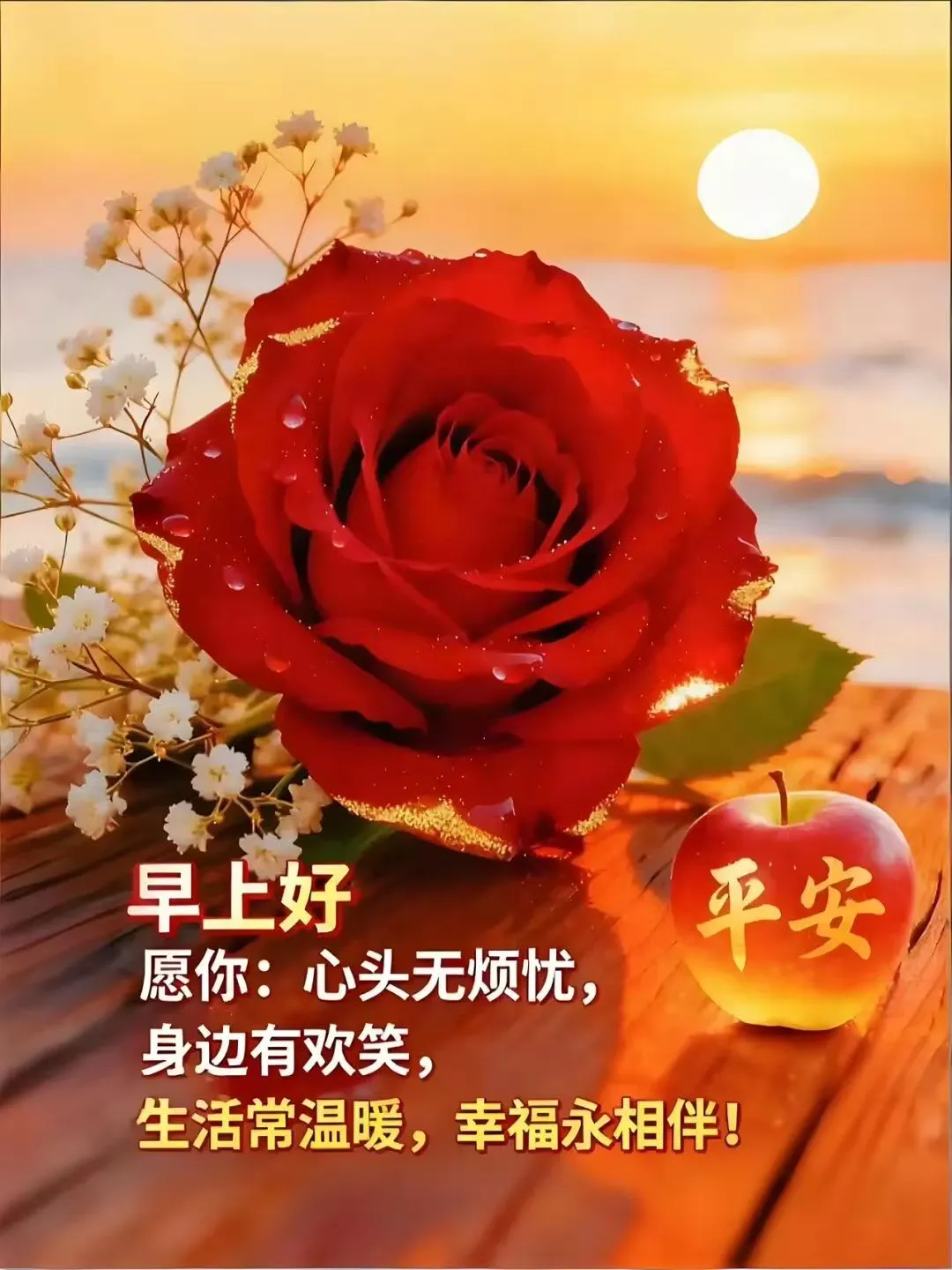 一句早安,万千祝福:愿你周六有清风拂面,有暖意入怀,有人问你粥可温,有人陪你立黄昏。世间最珍贵的,莫过于这份被惦念的温暖。早安,愿你幸福安康!