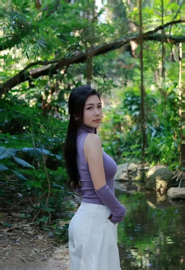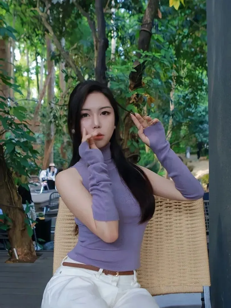 换另一种黑的长卷发,是另类的,是温柔中带有一点慵懒的韵味。淡紫色无袖针织背心配同色袖套同时穿着,在显眼的程度上是贴身的。米白色高腰休闲裤版型挺括,后侧方口袋加设计感。在林间的路上小树环绕构成的“森林”,其中生活着热带雨林里的精灵!