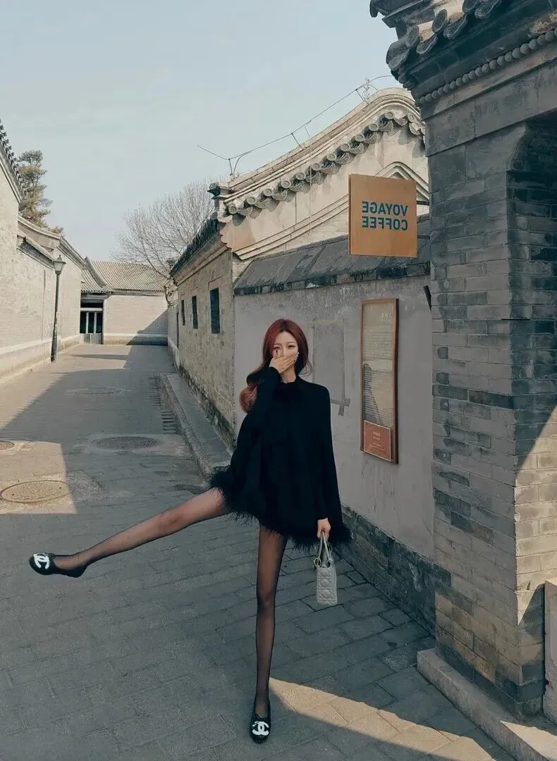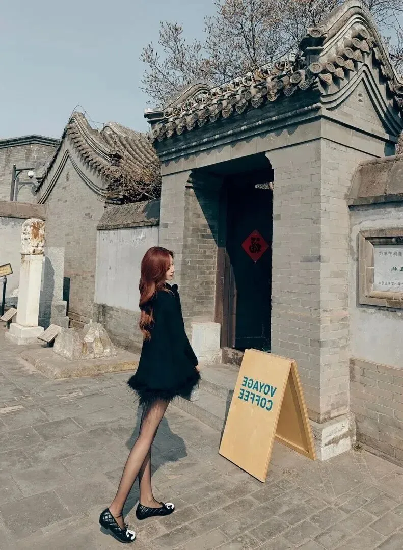 第二节她悠哉走在这条路上。门楼下红底的菱形福字,是表示福到了,给画面增加了一份亮色。枝头上新芽萌发出来,春天的气息就到了身旁。最能打动我的地方是它打破了一种对于时尚的固有印象。时尚并不一定要在高楼大厦、奢侈品店里找到。在老胡同的烟火气里,也能看到美。该女孩用行动向我们证明,穿搭不应当是约束,而应是表现自己的途径。无论是在何种情况下,找到自己的风格才是最重要的。如果你想用这种风格去尝试,可以试试羽线、丝袜、复古包等。但是最根本的还是要敢于做自己。在任何地方都可以成为最亮的风景。真正的时尚就是从内到外的气质。