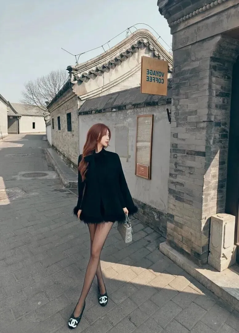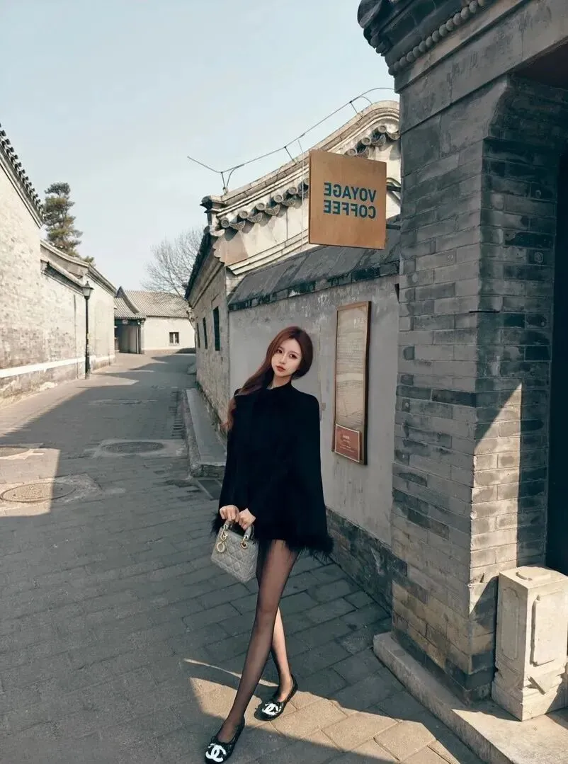 下身配了超薄黑色丝袜,把腿部线条勾勒得又细又长。脚上一双黑色浅口平底鞋,鞋头上白色双C标志。这种搭配低调而不失格调,一目了然地看出她的品位。其实这种风格并不是每个人都可以驾驭的。一不小心就太过分了。但她的拿捏十分精准。羽毛的飘逸感和胡同的安静氛围就这样奇妙地结合起来。右手自然下垂,手中有一条深灰色的链条包。包身菱形花纹中有金链镶入,在阳光照射下十分刺眼。整个画面有文艺范儿。