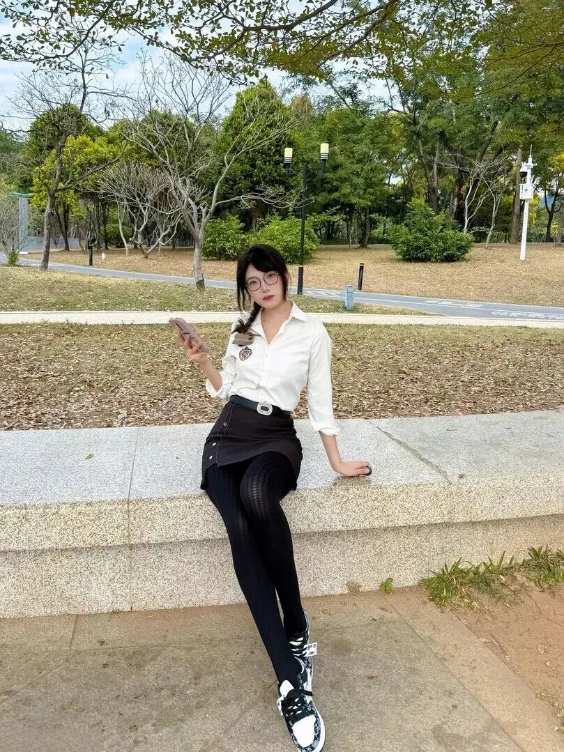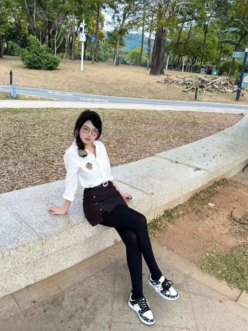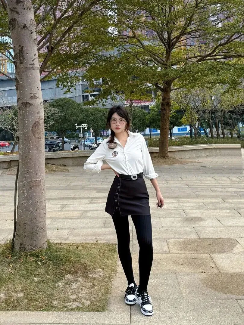 日常清新风更适合喜欢简单感的姐妹。衬衫的袖子卷起来,领口微开,露出脖子的线条,随意又自然。深灰色前开襟短裙配黑裤等于瘦下来、舒服。脚踏休闲板鞋整体干净利落,逛街购物或者买菜都可以穿着出去。