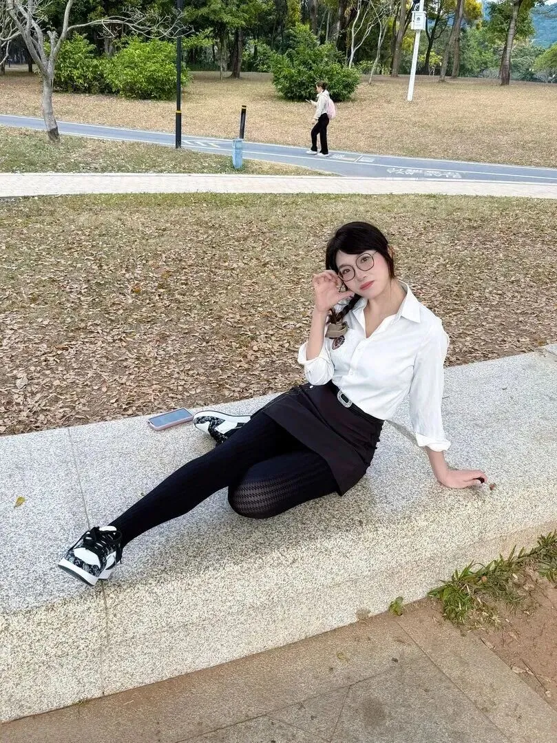 最后就是温柔自然风。米白色棉质衬衫柔软,穿起来就好像是穿在了阳光里一般。小姐姐随意挽起袖子、解开两个扣子,慵懒的气息一下就被凸显出来。黑色长裙是上身主要着装,条纹裤袜为下身的衣外之衣,一半开镂空网格。穿着黑白板鞋走起路来很舒适、自然,周末去公园散步、喝咖啡都不会觉得累。