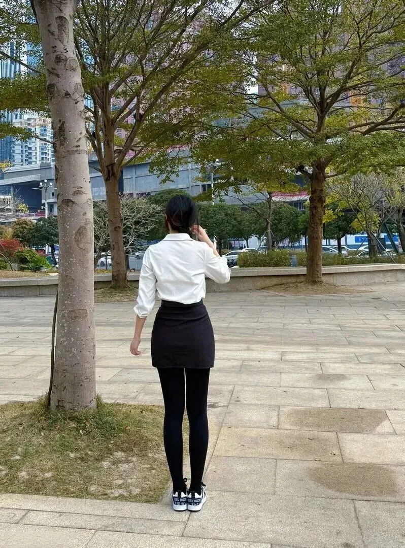最后就是简约日常风。背向镜头的小姐姐着米白衬衫和黑短裙,简约的基础款式中流露出高端的味道。袖口牢牢扣在手臂上,只剩下一小圈裸露的肩部没有穿着衣物,穿上紧身裤、袜子和皮靴的样子便形成了。平时出去散步或者拿快递的时候,带上一包就出门。