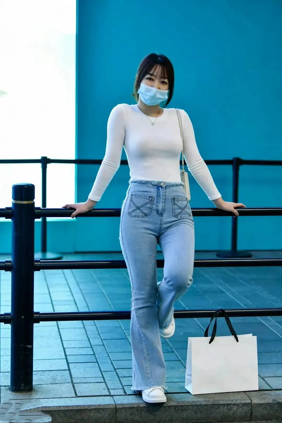 先讲她的上身搭配。一件白色修身短款针织衫把人紧紧地包住,使人显得十分精神。竖条纹设计显瘦、短款剪裁露出一点腰线,不夸张又巧妙地改善了身材比例。上衣单穿又清秀又暖和,冬天内搭也合适,真的是百搭之选。