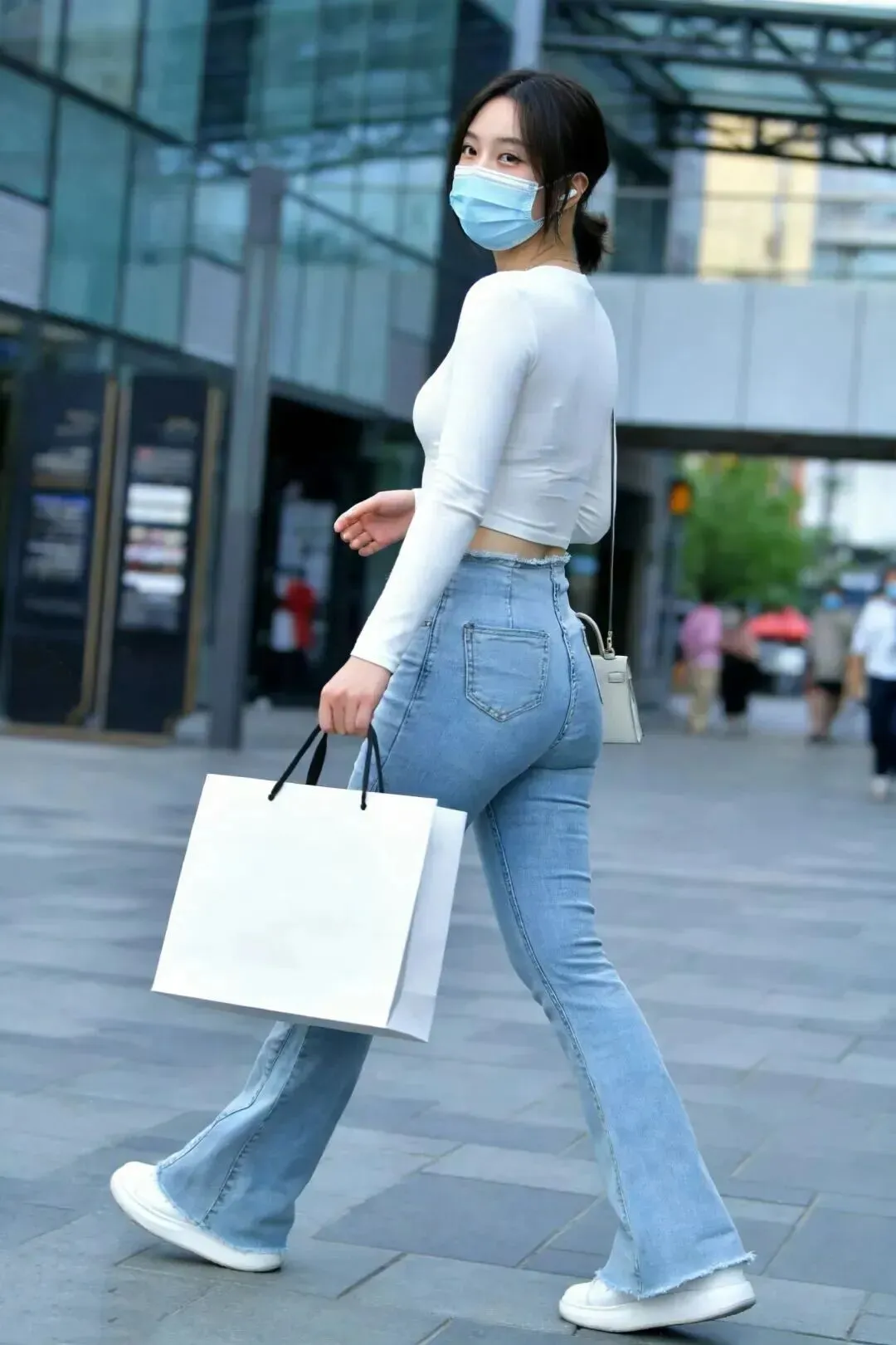 下身浅蓝色高腰微喇牛仔裤就是点睛之笔。高腰设计拉长腿部线条,小个子姐妹穿上会立即变成模特身材。微喇裤脚带点复古气息,走起路来飘逸有型。裤脚磨损处有随意感,水洗颜色淡淡的配搭,与板鞋、小高跟都不违和。