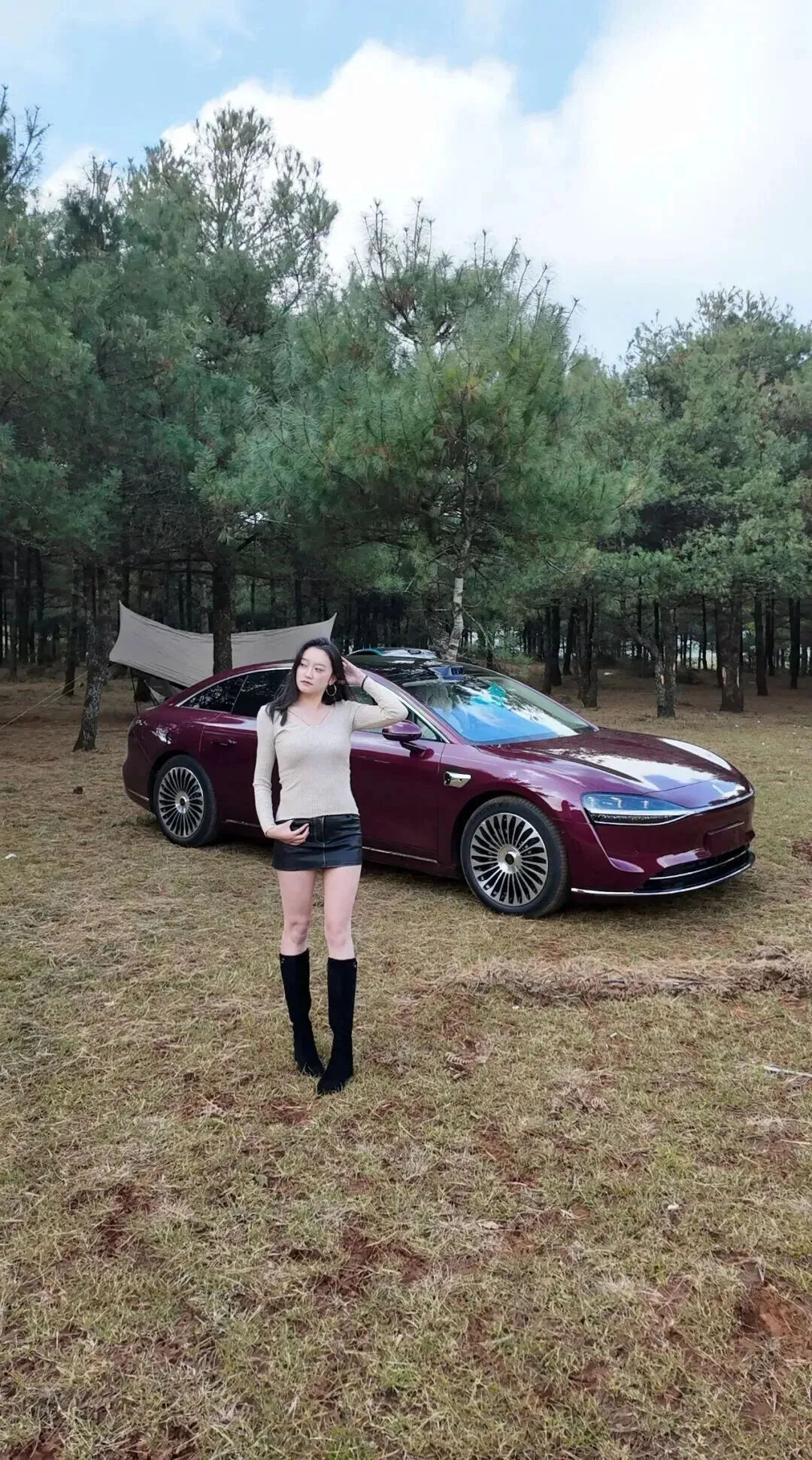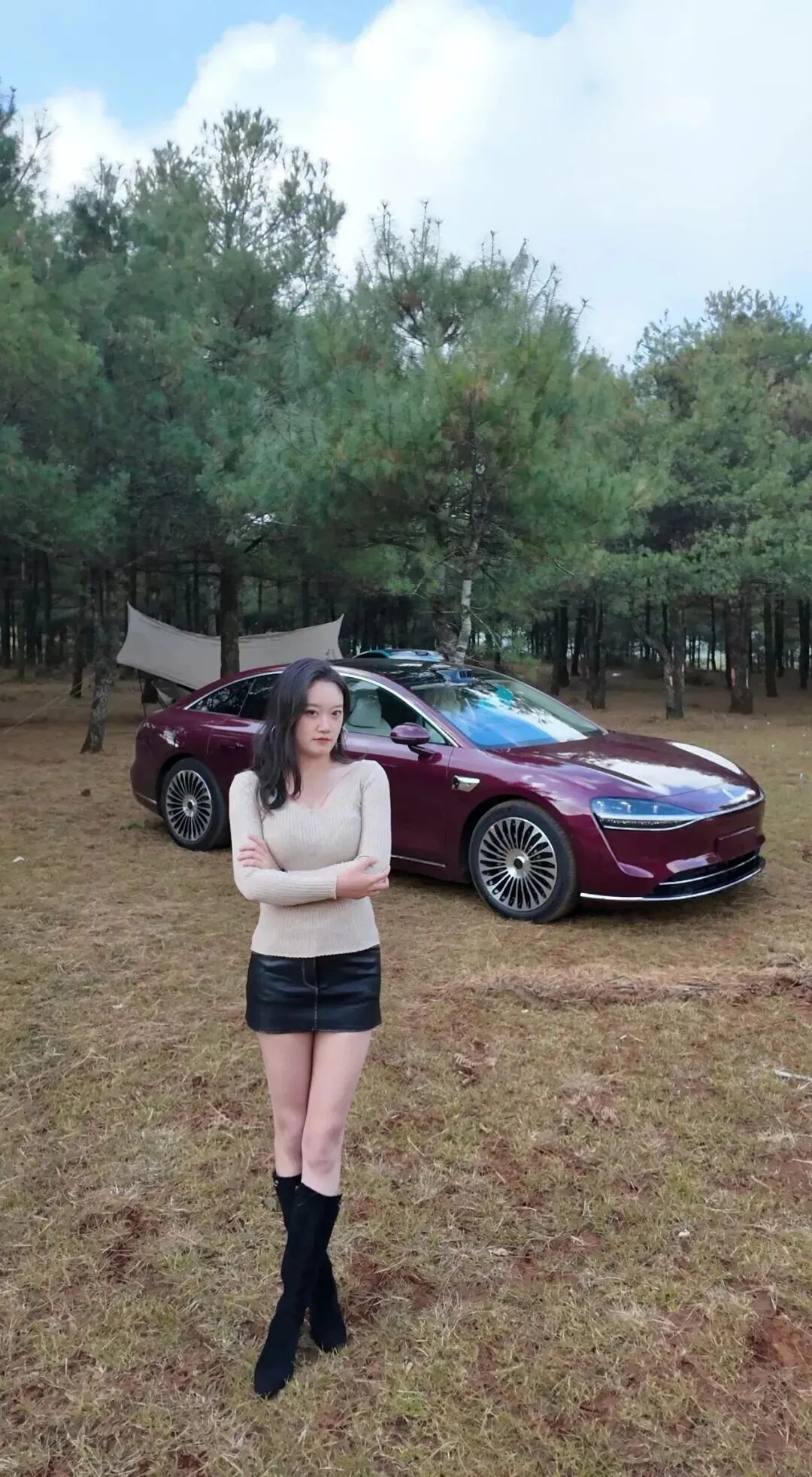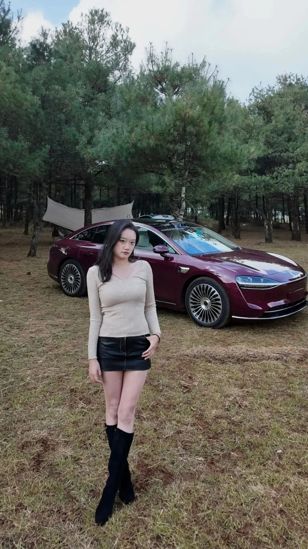 黑色皮裙最好为A字形,长度到膝盖上方一厘米左右,对小个子来说比较适合。裙摆微微打开,遮挡住大半条腿,在行进的时候是稍微呈弧形的,有一种英气十足的活泼感。皮质选哑光带光泽的,比漆皮要低调一些,日常穿着刚刚好。长靴要过膝的,靴筒贴腿但不勒,靴口留一点空间,卡在大腿最细的地方。黑色长靴配皮裙,视觉上拉长腿部,腿长瞬间加10厘米不是梦!